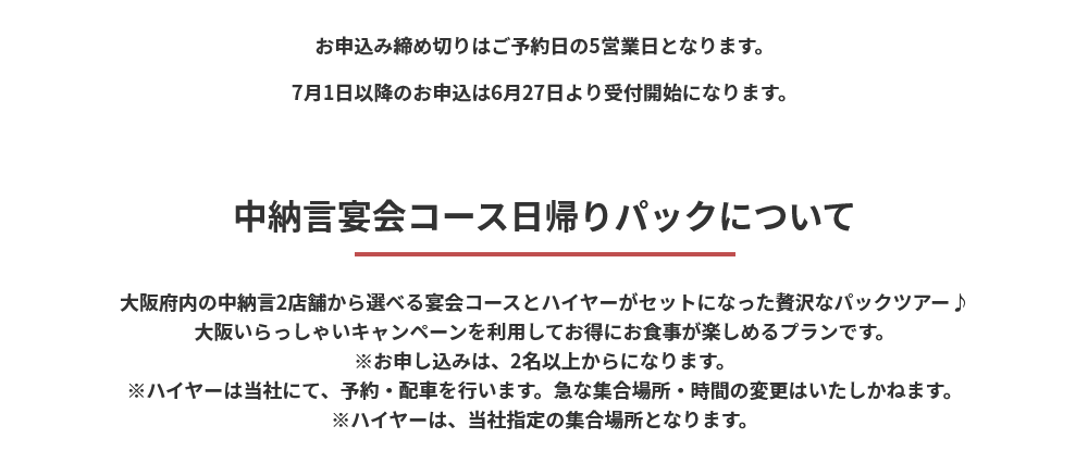 大阪府内の中納言2店舗から選べる宴会コースとハイヤーがセットになった贅沢なパックツアー♪