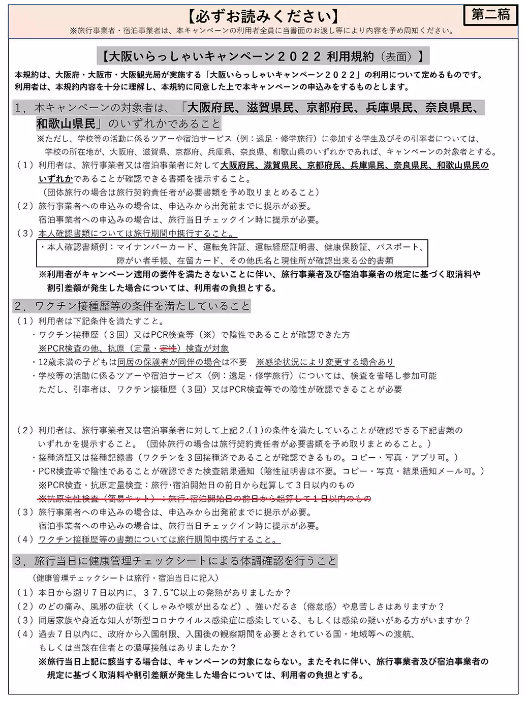 「大阪いらっしゃいキャンペーン」のご利用にあたっては、次の内容を必ず守っていただき、安全・安心なご旅行をお願いします。お約束、ご協力いただけない場合は、「大阪いらっしゃいキャンペーン」をご利用いただけません。 また、不正な手段などによりご利用された場合は、割引支援金の返還を請求することがあります。