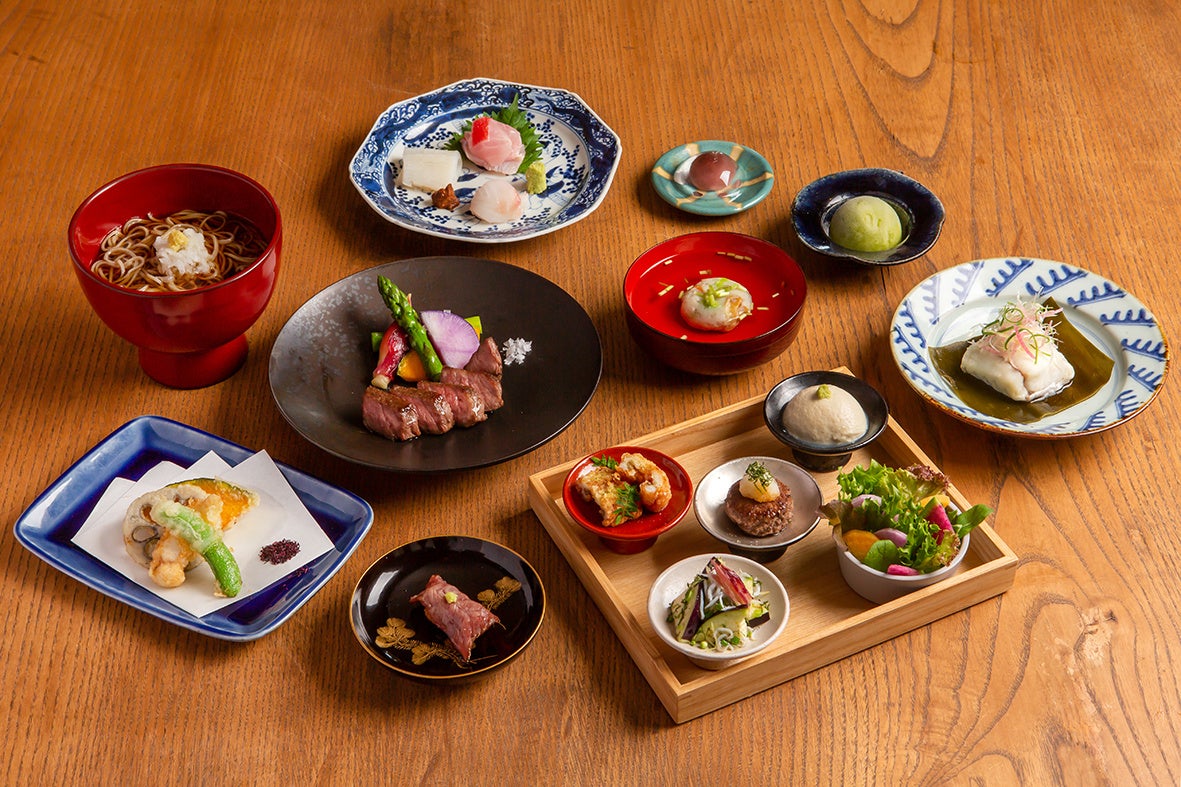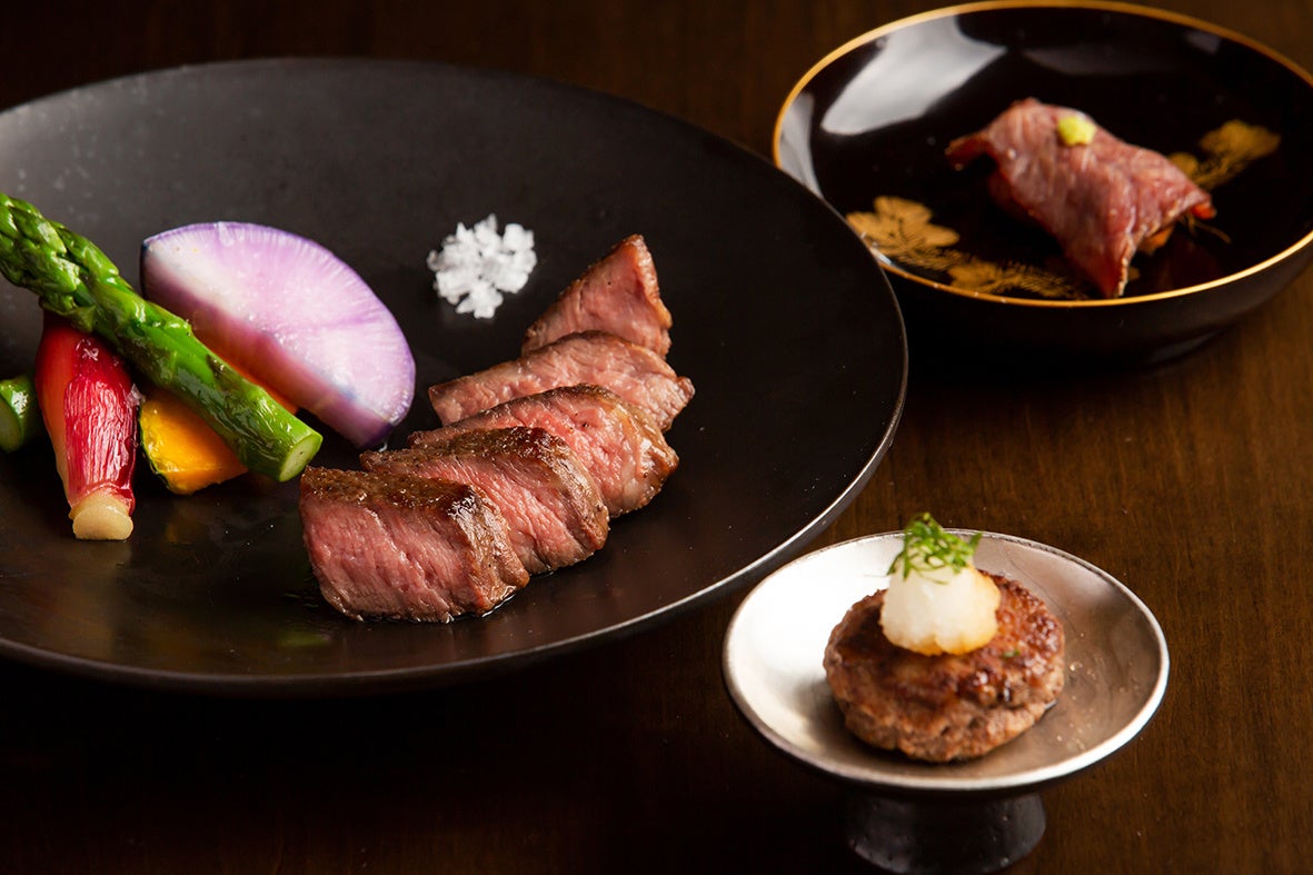 HOTEL AO KAMAKURA1階ダイニング 「鎌倉 松原庵 青」では、料理長の目利きで選んだ、地魚や神奈川県産の食材をふんだんに使ったディナーコースをご用意しております。6/14からご提供するメニューは、三浦半島の自然豊かな土壌で育った幻の銘柄牛「葉山牛」。飼料にこだわりをもって育てられた、甘みが広がる柔らかな肉質と、とろけるような脂身が特徴の「葉山牛」は、年間250頭ほどしか出荷されない希少なブランド牛です。一口ハンバーグ、揚げそばがき寿司、葉山牛の炙りで味わうディナーコースをぜひご堪能ください。