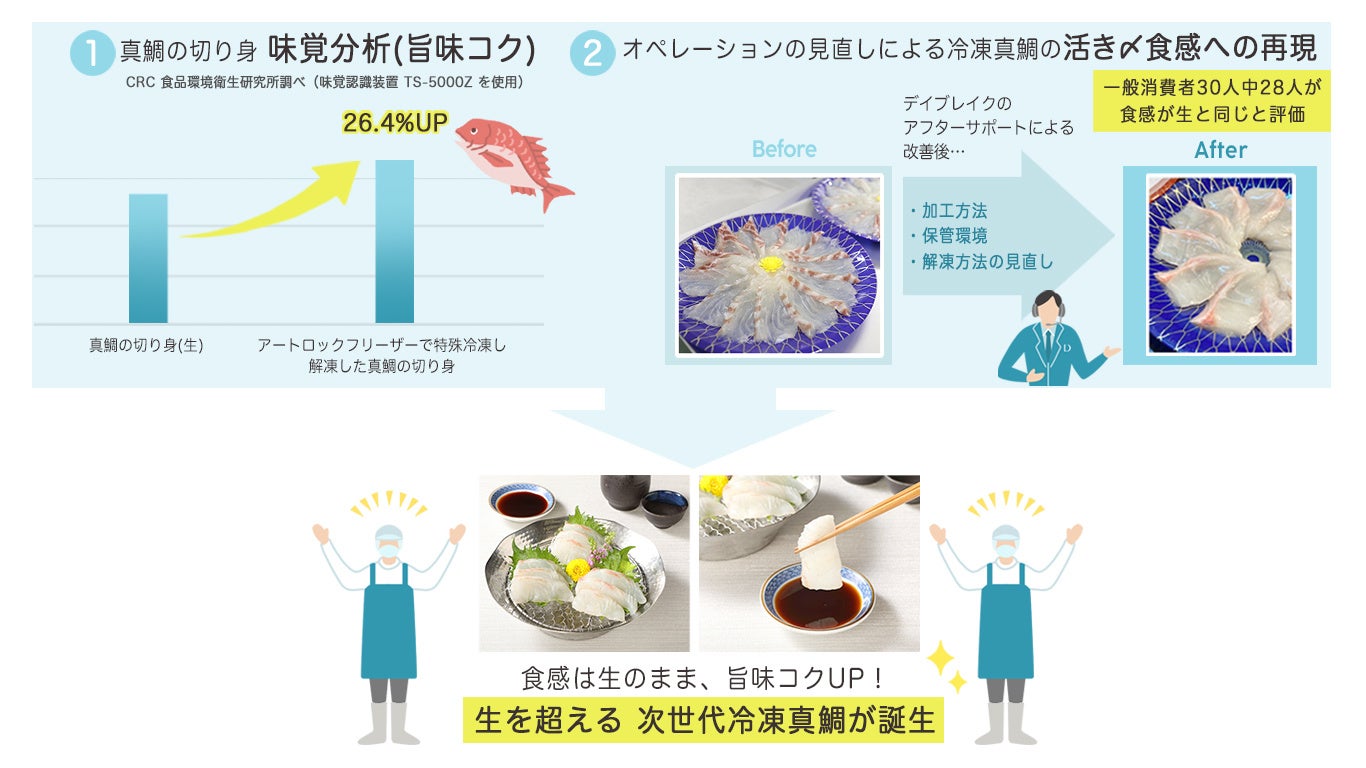 特殊冷凍テクノロジーを活用した「Freezing as a Service®」を展開するデイブレイク株式会社(本社:東京都品川区、代表取締役:木下昌之、以下デイブレイク)と、水産物の養殖・加工・販売を手掛ける株式会社ふく成(本社:熊本県熊本市西区、代表取締役:平尾 優、以下ふく成)は、CRC食品環境衛生研究所が実施した味覚分析の結果、デイブレイクの特殊冷凍機「アートロックフリーザー」で冷凍したふく成の真鯛(解凍)が、生の真鯛よりも旨味コクが向上したことを実証いたしました。
