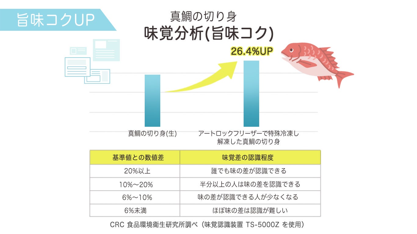 CRC食品環境衛生研究所の味覚分析結果によると、ふく成の特殊冷凍真鯛の切り身(解凍)が、生の真鯛の切り身よりも「旨味コク」数値が26.4%(※)向上したことを確認。呈味物質(味を感じさせる物質)濃度が20%変化すると人は味の変化を認識すると言われており(ウェーバーの法則)、一般的に人が認識できるレベルで旨味コクが向上したことが、検査結果によって明らかになりました。