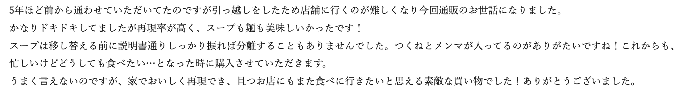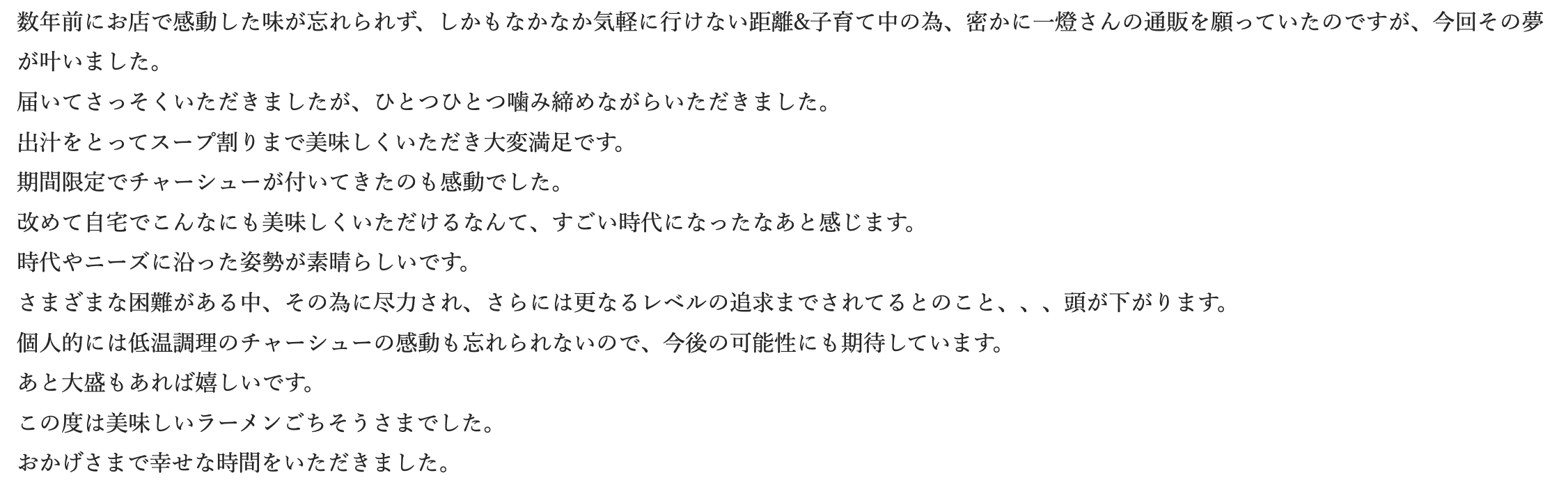 これまで『麺屋一燈公式通販』は、SNSの公式アカウントなどで周知・案内をし、一燈ファンの方々を中心のご愛顧頂いて参りました。その中でお客様から頂いた声を一部抜粋してご紹介させて頂きます。