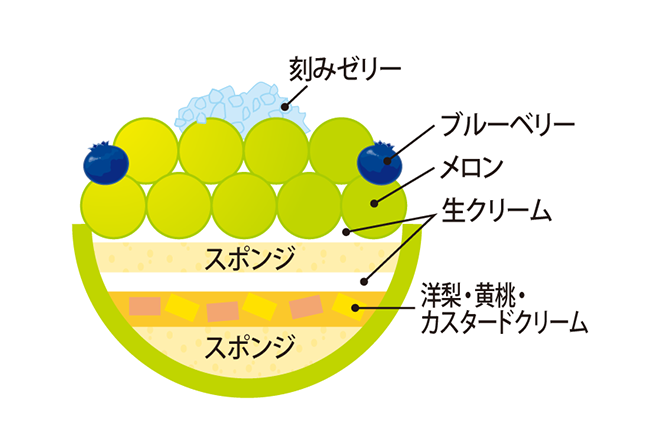 この「琴引メロン」をくり抜いて器にし、スポンジ、生クリーム、カスタードクリーム、フルーツを重ねたケーキが『ムロン ア ラ シャンティ』です。年に一度の「七夕」の時期にしか出会えない、贅沢な味わいのケーキとして毎年ご好評をいただいております。