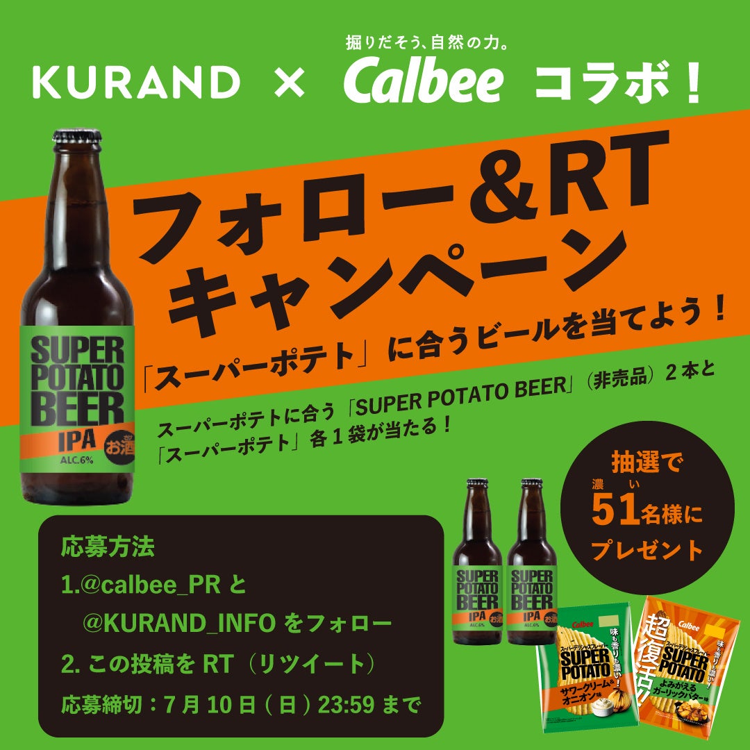 お酒のオンラインストア「KURAND」とコラボしたプレゼントキャンペーンを2022年7月4日(月)に「KURAND」の公式Twitterアカウント「KURAND」(@KURAND_INFO)にて実施します。「KURAND」公式TwitterアカウントとカルビーPR部公式Twitterアカウント(@calbee_PR)をフォローし、キャンペーン投稿をリツイートすることで、『スーパーポテト サワークリーム&オニオン味(1袋)』と『スーパーポテト よみがえるガーリックバター味(1袋)』、さらに、KURANDが選ぶスーパーポテトにピッタリな味わいのオリジナルラベルのクラフトビール「SUPER POTATO BEER(2本)」(中身はIPAタイプのクラフトビール)のセットが51名様に当たります。