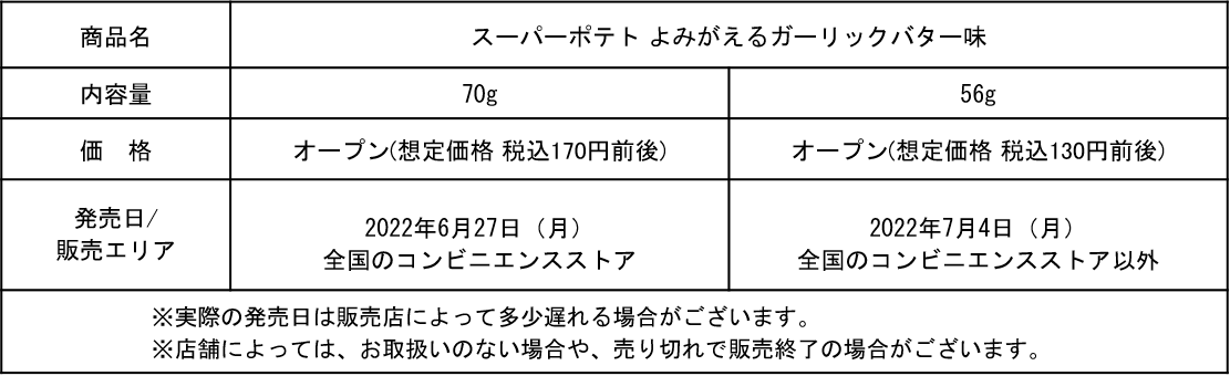 カルビー株式会社(本社:東京都千代田区、代表取締役社長:伊藤 秀二)は、香料「フリス®」を使った濃厚な味付けの厚切りポテトチップス「スーパーポテト」より、新商品『スーパーポテト よみがえるガーリックバター味』を2022年6月27日(月)より、コンビニエンスストア先行で期間限定発売(8月上旬終売予定)します。コンビニエンスストア以外の店舗では、2022年7月4日(月)から発売します(10月上旬終売予定)。