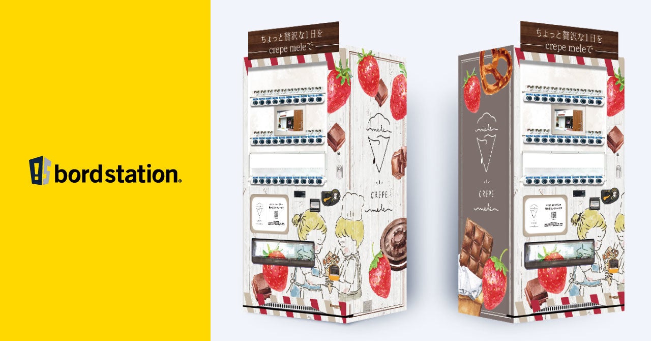 株式会社MJE(本社:大阪市中央区、代表取締役:大知 昌幸)は、当社が提供する看板型デザイン自動販売機「bord station(ボードステーション)」を、株式会社飯塚(本社:栃木県足利市)に設置しました。設置する自販機は「crepe mele(クレープ メレ)」のデザインをあしらい、クレープを販売予定です。