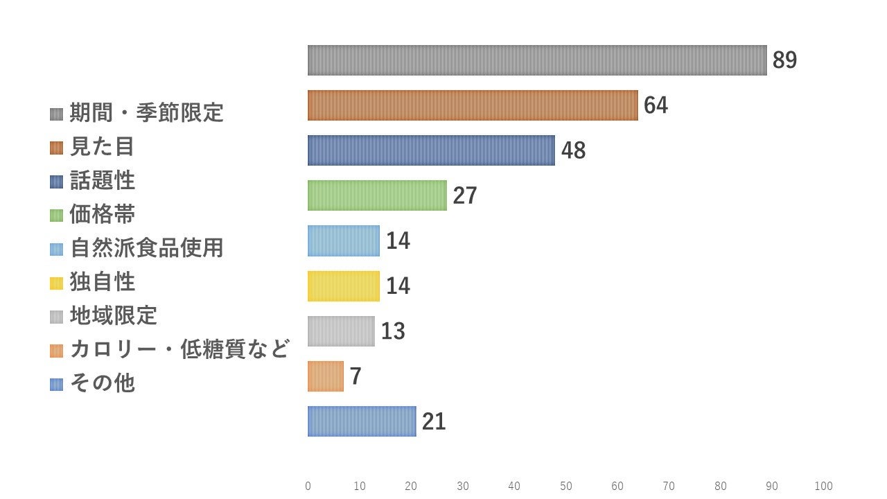 最も多かった回答は「期間・季節限定」で全体の約3割、次に「見た目」「話題性」「価格」…と続きます。
