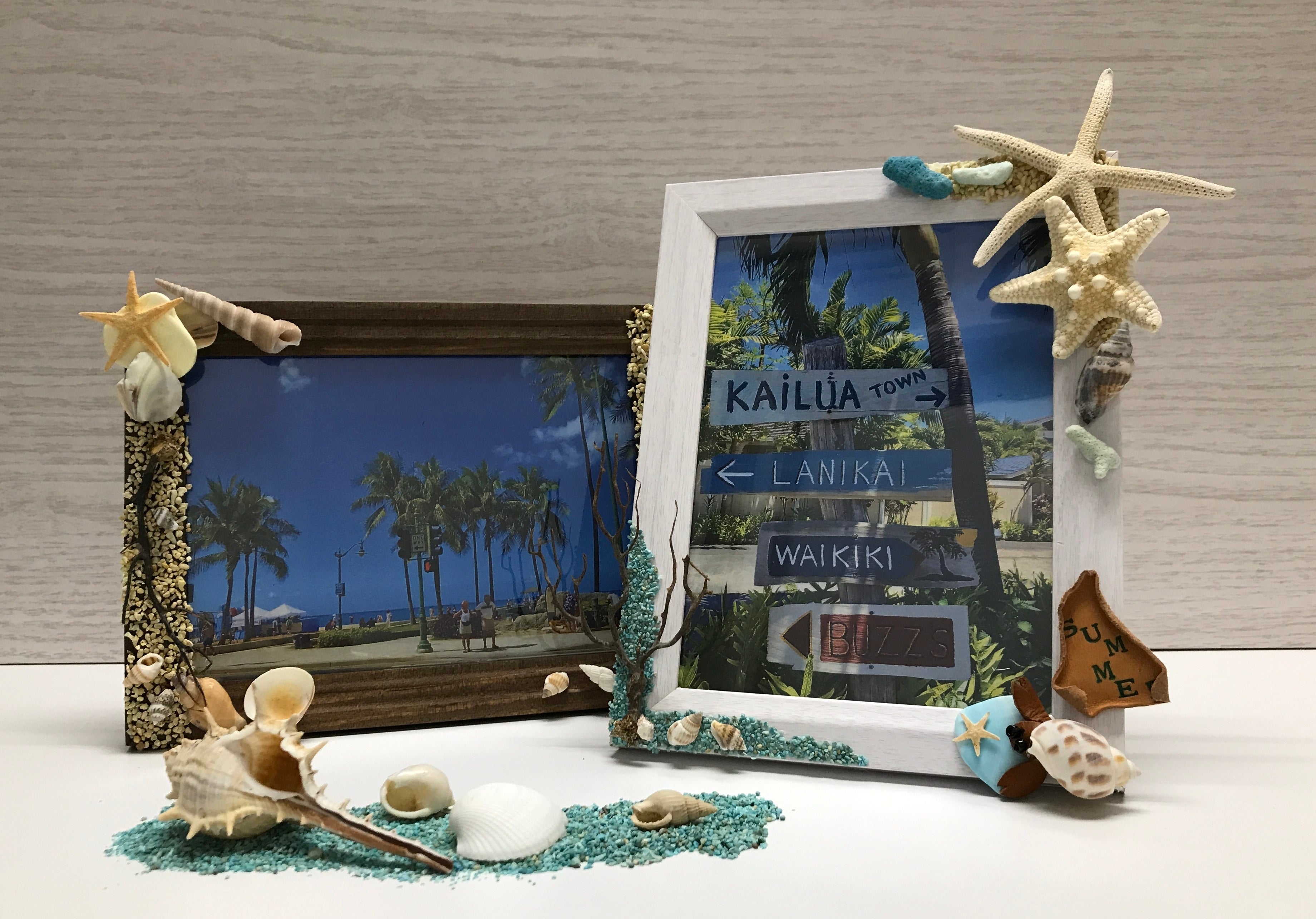 自分で好みの貝殻や飾りつけを選び、思い出の写真を飾るフォトフレームを作ります。