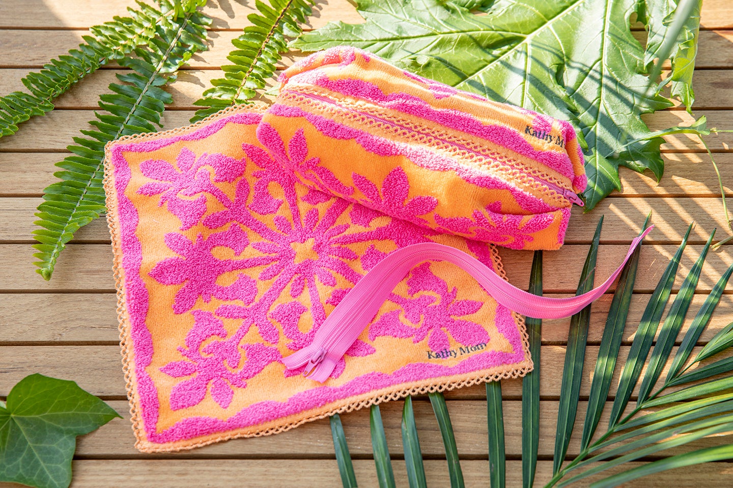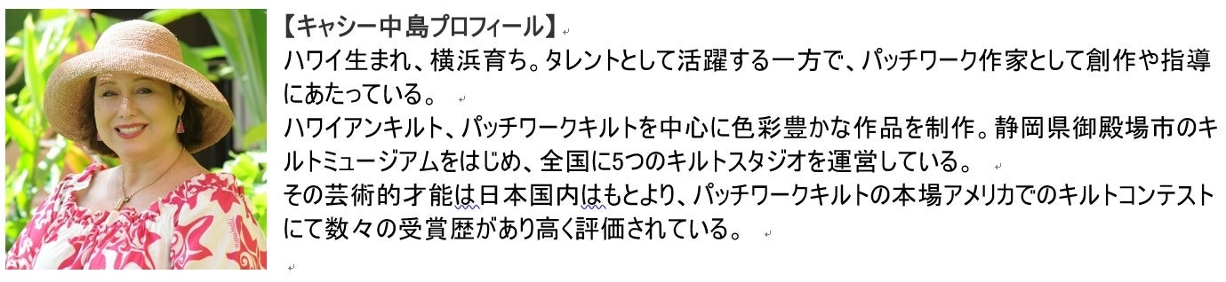 キャシー中島さん監修のハワイアンキルト柄のタオルを使って針と糸を使いながらポーチを作ります。キャシー中島さん公認インストラクターによるワークショップです。