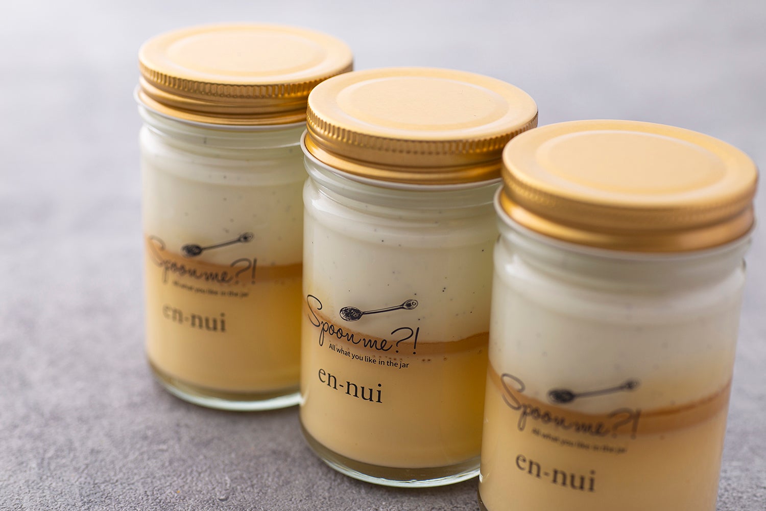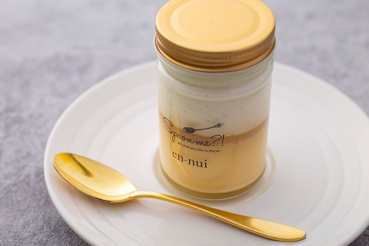 完熟はちみつをしっかり感じられるクリーミーなプリンとバニラビーンズをふんだんに使用した、香り豊かであっさりとしたバニラプリンの2層の異なる食感の間に、濃厚な生キャラメルを挟みました。風味や食感の違いを楽しみながらお召し上がりいただける一品です。