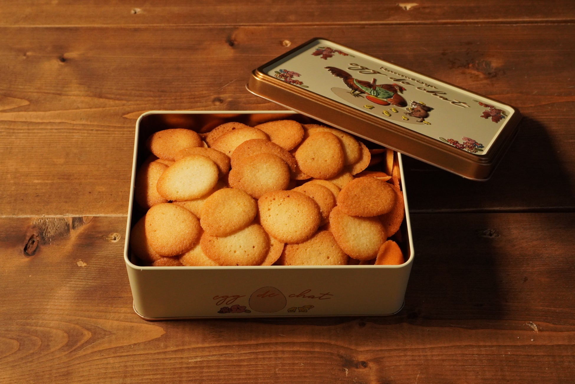 可愛いイラストが描かれたオリジナルのクッキー缶ギフト。おなかを空かせた迷子の子猫。めんどりのお母さんに「まほうのたまご」でお菓子を焼いてもらいました。やさしくて、おいしくて。心がふんやり幸せになりました。そんな物語に思いを馳せてエッグドシャは誕生しました。自社ブランド卵「磨宝卵GOLD」を使用した、薄焼きの軽いサクサク感と、豊かな風味のコラボレーション。贅沢な味わいとやさしい時間をお楽しみ下さい。