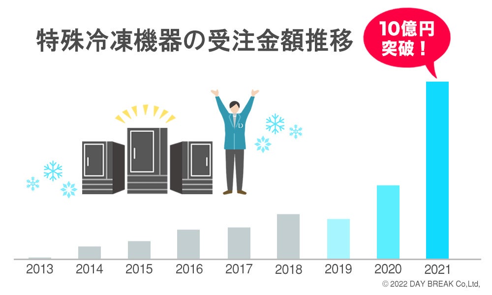 国内の特殊冷凍機・急速冷凍機の市場は年間100億円程と分析していますが、今期はそのうちの10%(10億)をおよそ10カ月で達成できました。大変名誉な結果で、デイブレイクに共感・賛同してくださるユーザーの皆様に、心より感謝いたします。