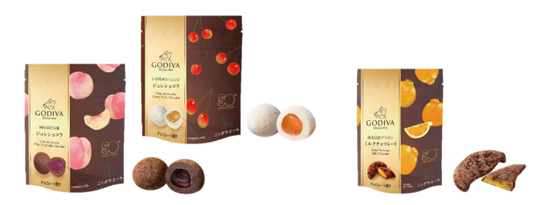 「GODIVA×全農 コラボレーションプロジェクト」の第6弾商品として登場するのは、フルーツのジュレをチョコレートで包み込んだ「ジュレショコラ」2商品と、ドライフルーツをチョコレートでコーティングした「ドライフルーツのチョコレートがけ」1商品。