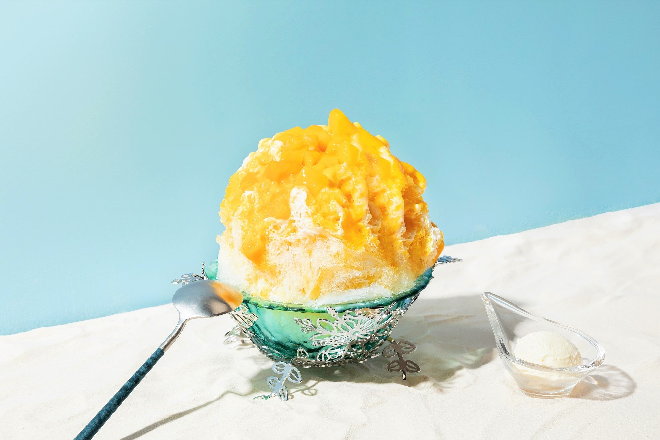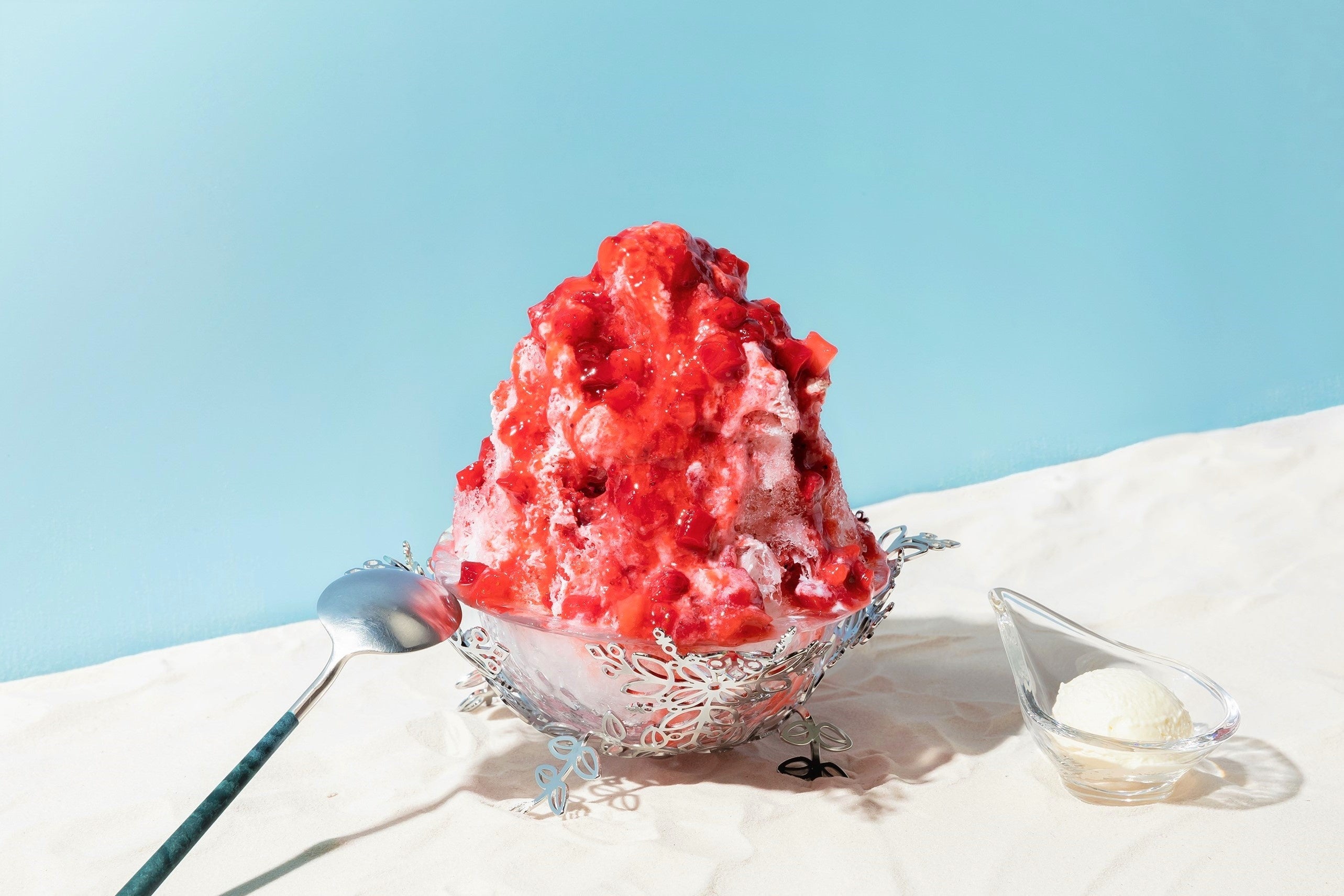 アイスの上に、口溶けの優しいふわふわの氷をたっぷりと盛り付けました。濃厚なミルクソースと果実味豊かなソースでお楽しみいただくかき氷です。別添えのチーズムースで味の変化もお楽しみいただけます。