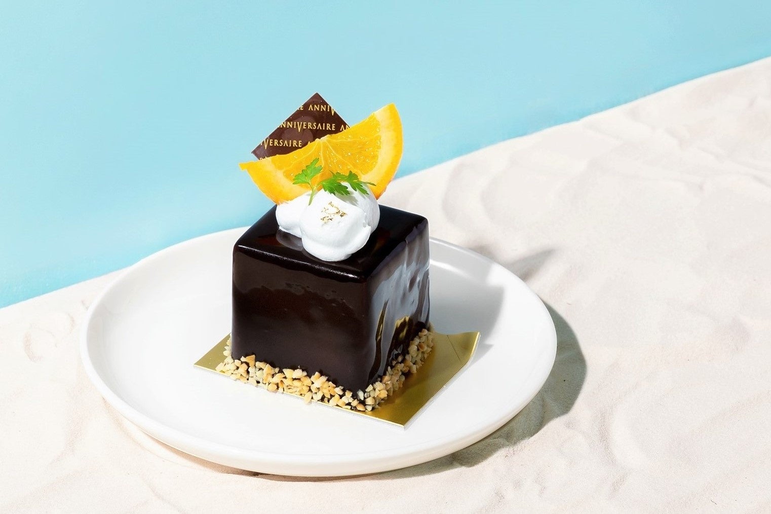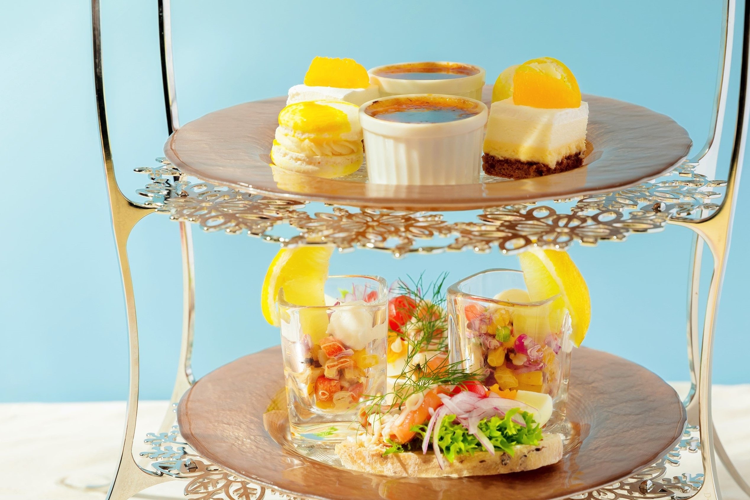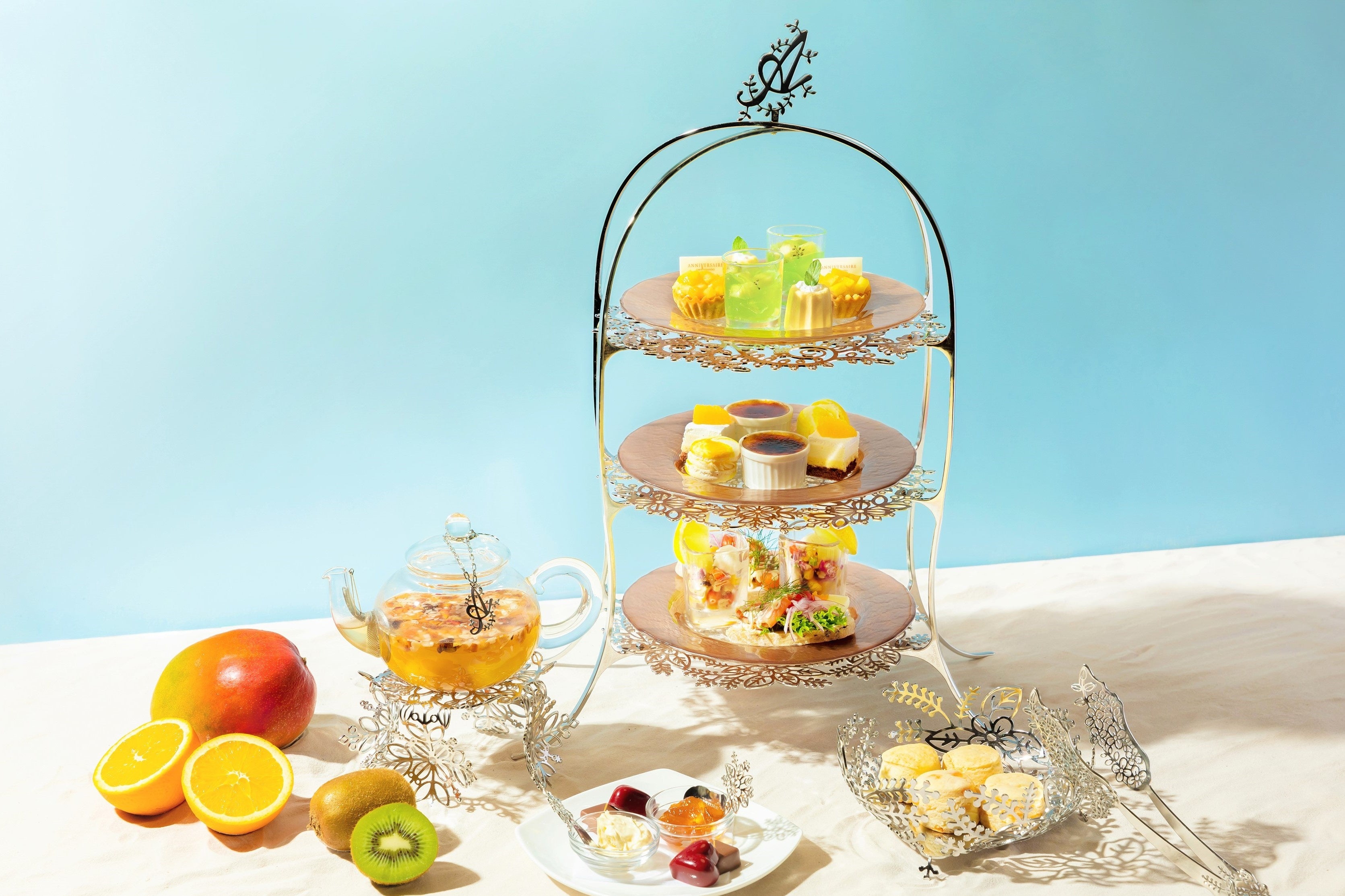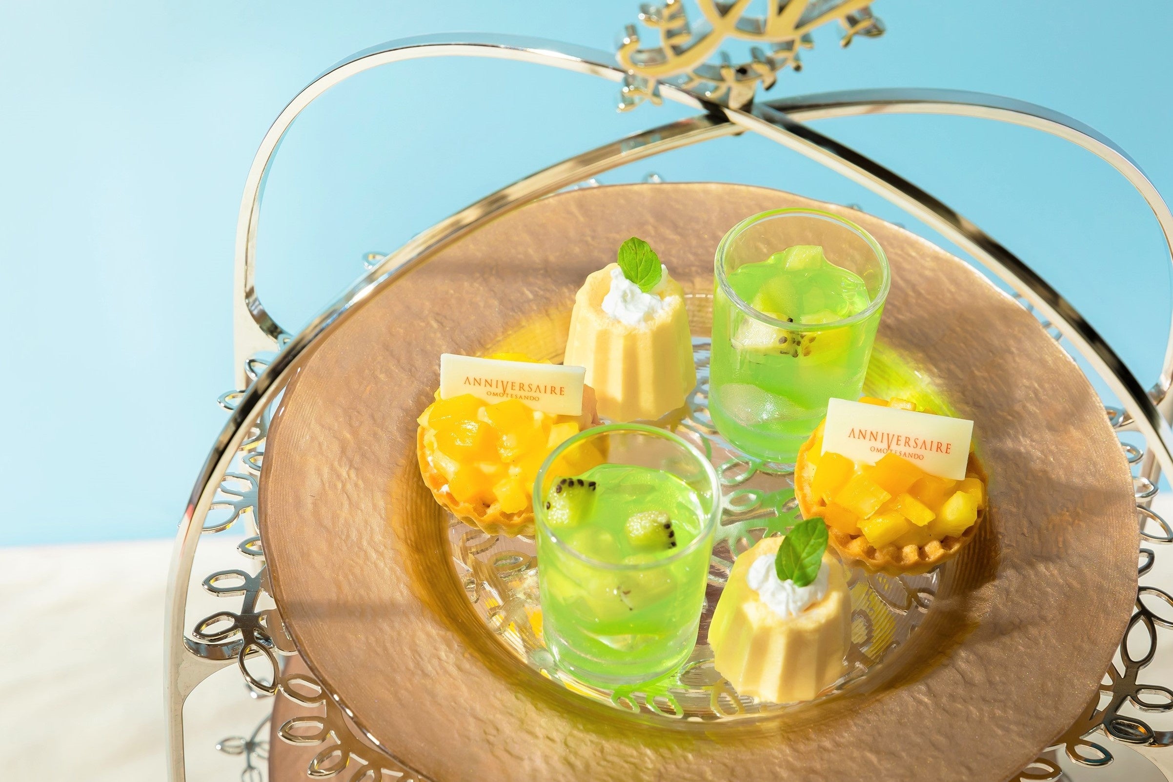 トロピカルフルーツを使用した夏らしい爽やかなスイーツが、ANNIVERSAIREの「A」をモチーフとしたオリジナルのアフタヌーンティースタンドに贅沢に並びます。