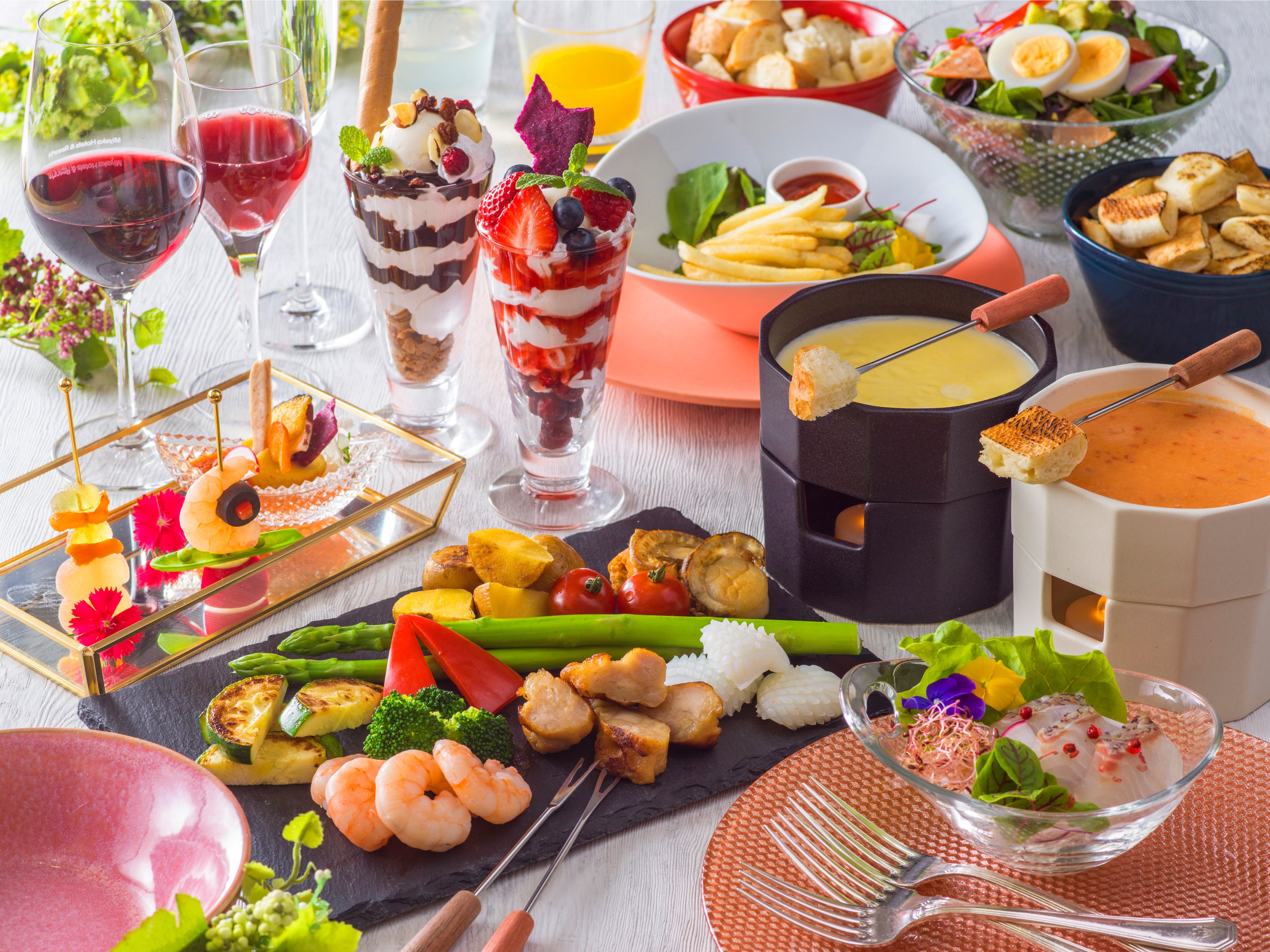 チーズフォンデュまたは、スパイシーなエスニックチリフォンデュをメインに、気軽につまめるピンチョスやシェフサラダなどのお料理に、デザートはパフェをご用意。ドリンクは、スパークリングワインやカクテル、ハードセルツァーなどフリーフローでお楽しみいただけます。Blu-rayプレイヤー、モニターを特典にて無料貸し出ししますので、好きなアーティストのLIVEや映画鑑賞も可能です。