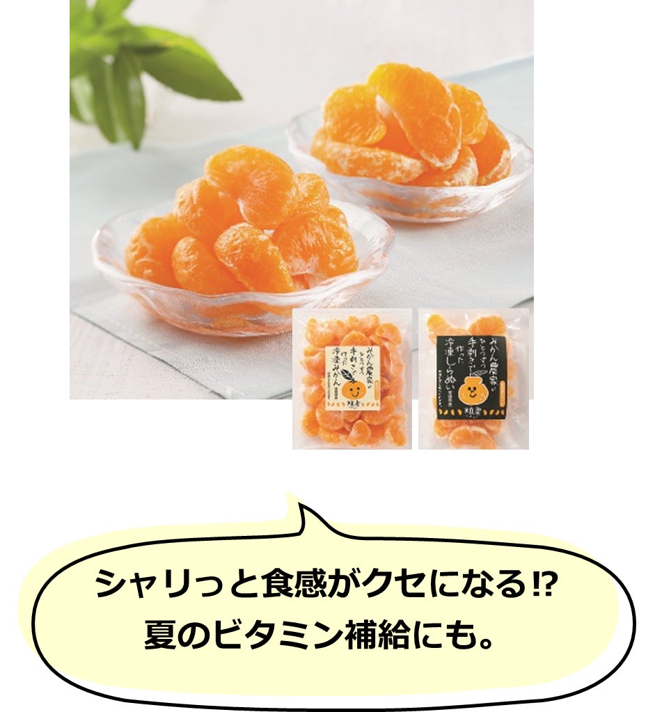 愛媛県産のみかんとしらぬいを、房の状態にまで分け、 凍結させました。凍ったままシャーベット感覚でシャリシャリとした食感をお楽しみください。