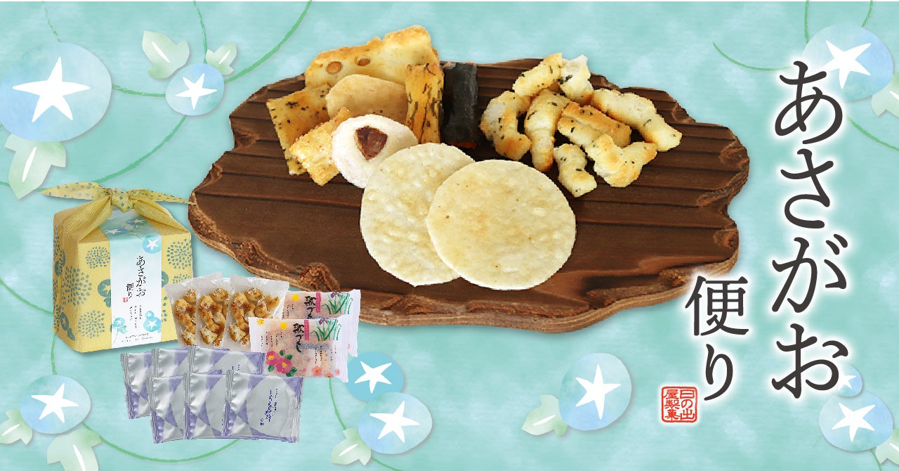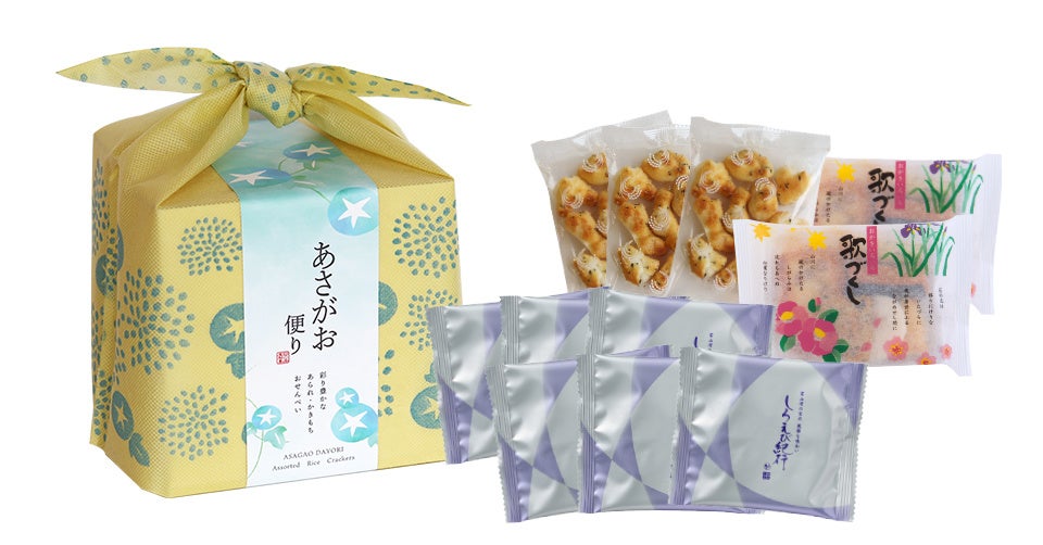 「あさがお便り」は富山柿山の看板商品「しろえび紀行」と7種類の個性豊かな米菓を楽しめる「歌づくし」、そして夏季限定商品のマヨネーズ風味の昆布あられ「マヨこぶ柿」の3種類の商品が楽しめるバラエティ豊かな夏季限定のカジュアルギフト商品です。