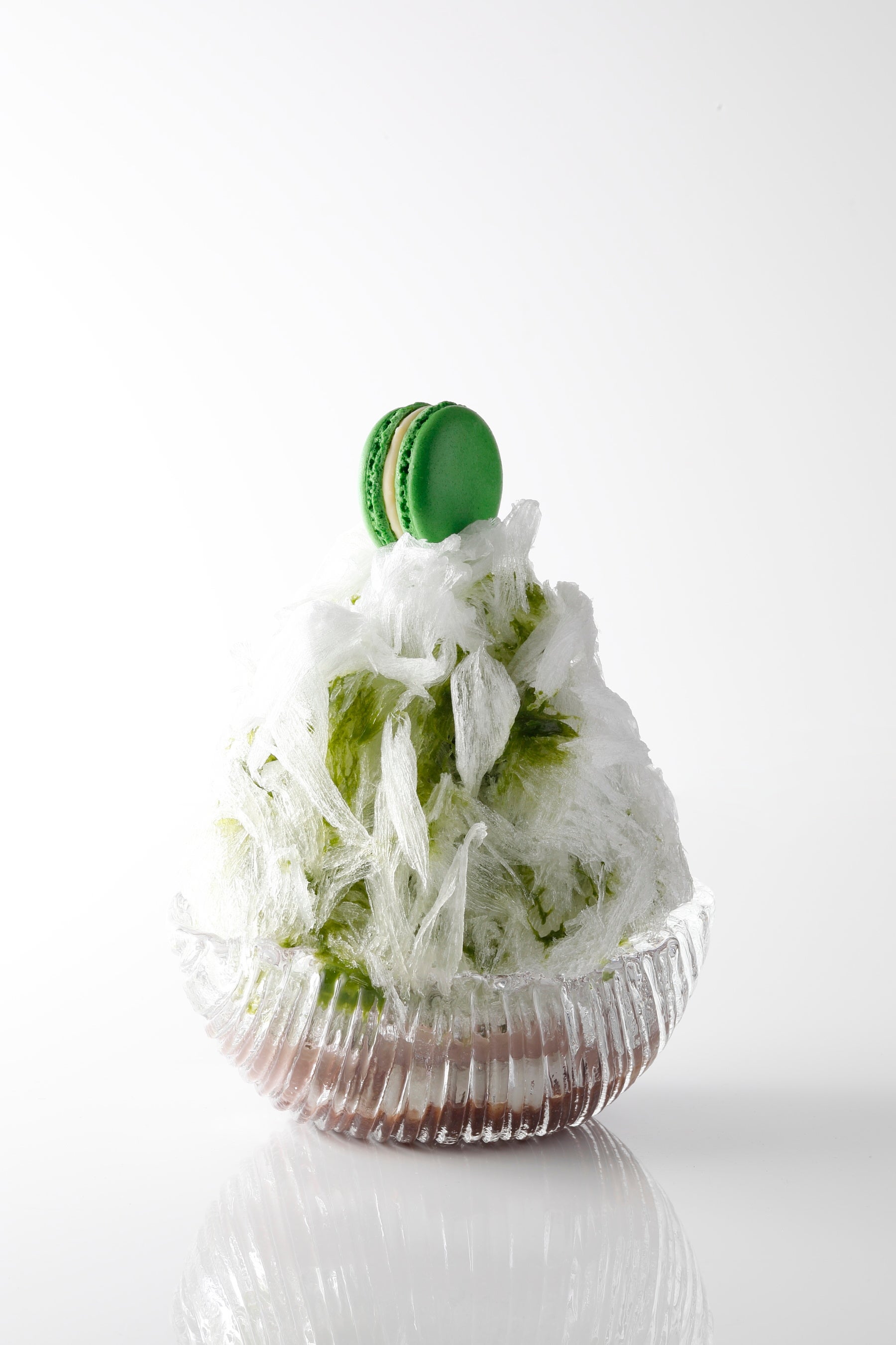 香り豊かな抹茶のソースに舌触りのすっきりした羊羹ゼリー、黒蜜あんこを合わせ、本格的な和の味わいにまとめたかき氷。天然氷の中に忍ばせた丹波の黒豆が食感のアクセントとなっています。