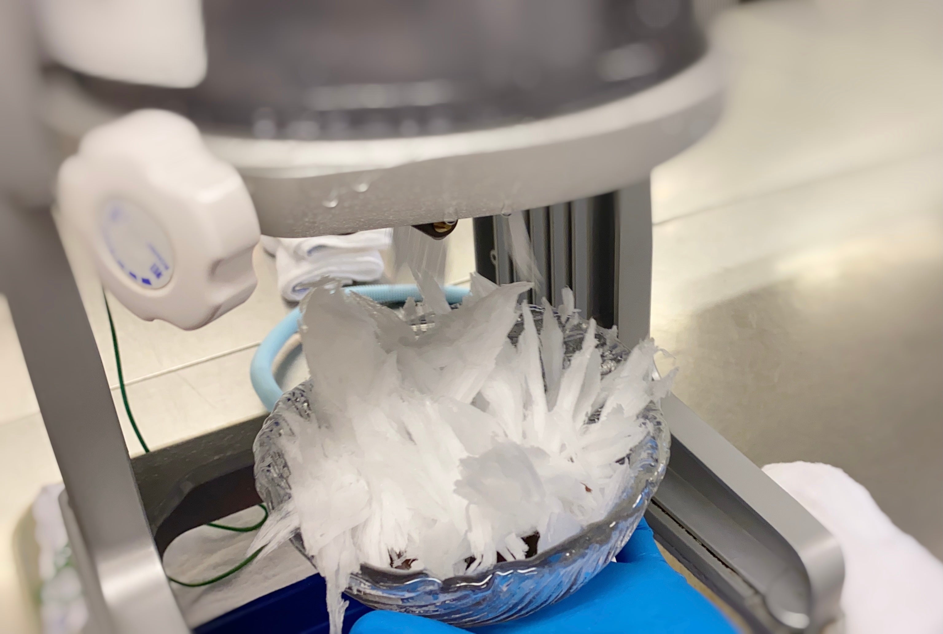 氷は南アルプス・八ヶ岳の天然氷を使用。氷室による保存法を頑固に受け継いでおり、名水と名高い八ヶ岳の湧き水を手を加えずに自然に凍るのを待ち、切り出して氷室に氷を積み上げ、おがくずで大切に保存しています。