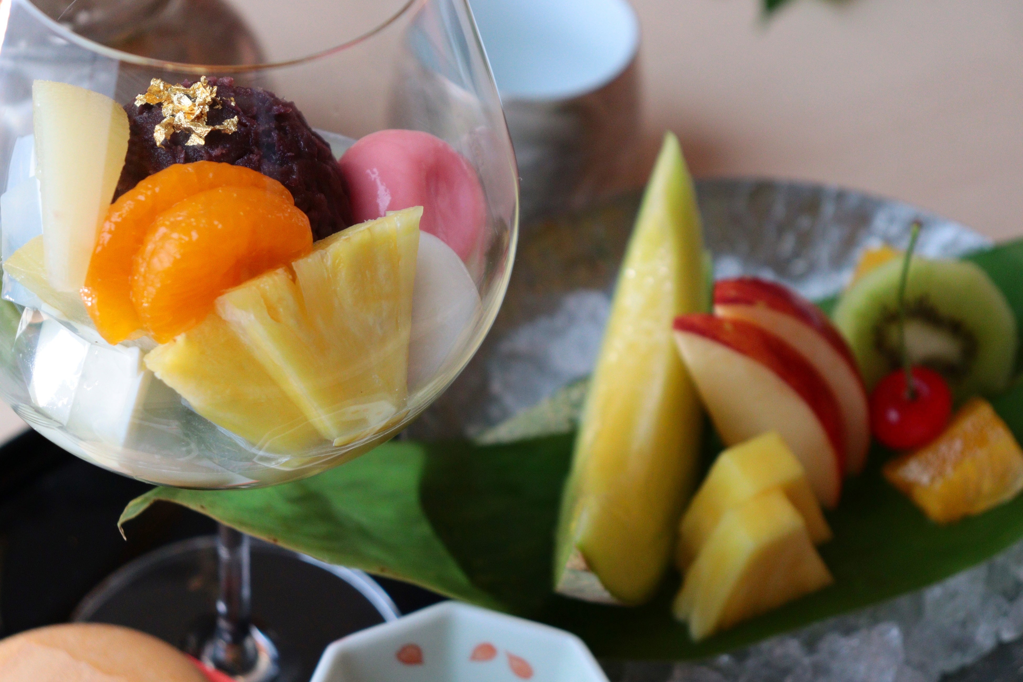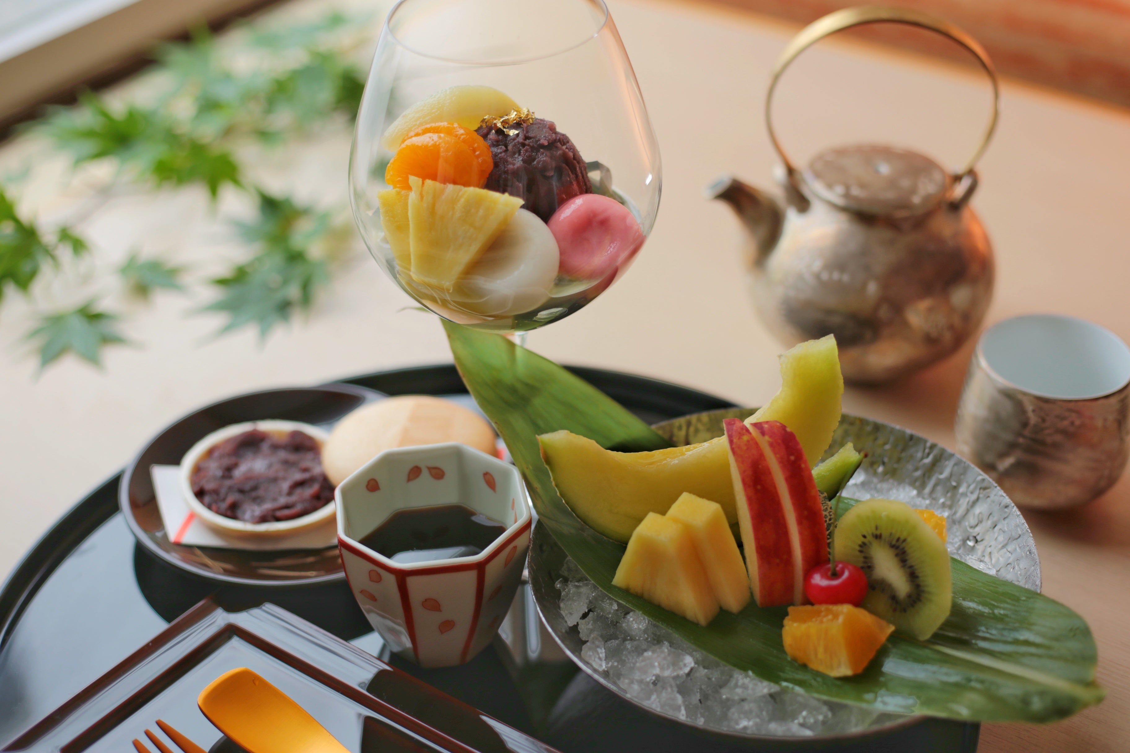 食べる場所によってさまざまな味わいが楽しめるのもまた魅力の一つ。料理長厳選の目利きされたフルーツを使用し、見た目も涼やかで華やかな当店自慢の贅沢あんみつです。
