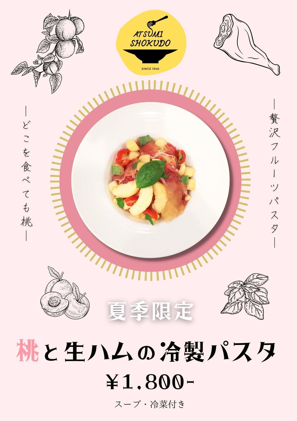 神保町 ATSUMI食堂では、夏の恒例となった、たっぷりの桃と生ハムを使った冷製パスタを、6月28日(火)より販売開始