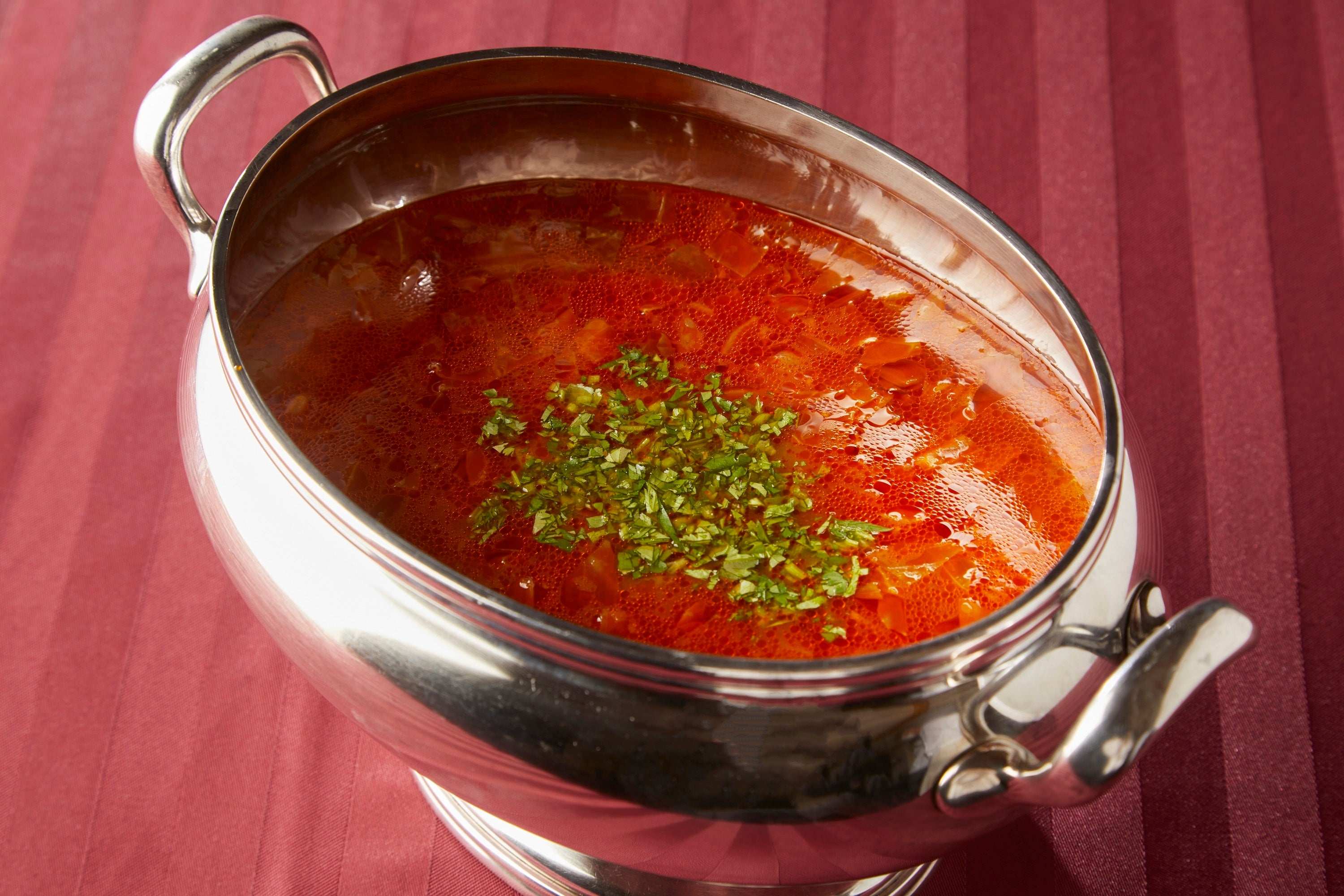 玉ねぎやジャガイモ、大豆が入ったトマトベースのスープ。ほのかに香るカレーの風味とパクチーの爽やかなエッセンスが食欲を引き立たせます。