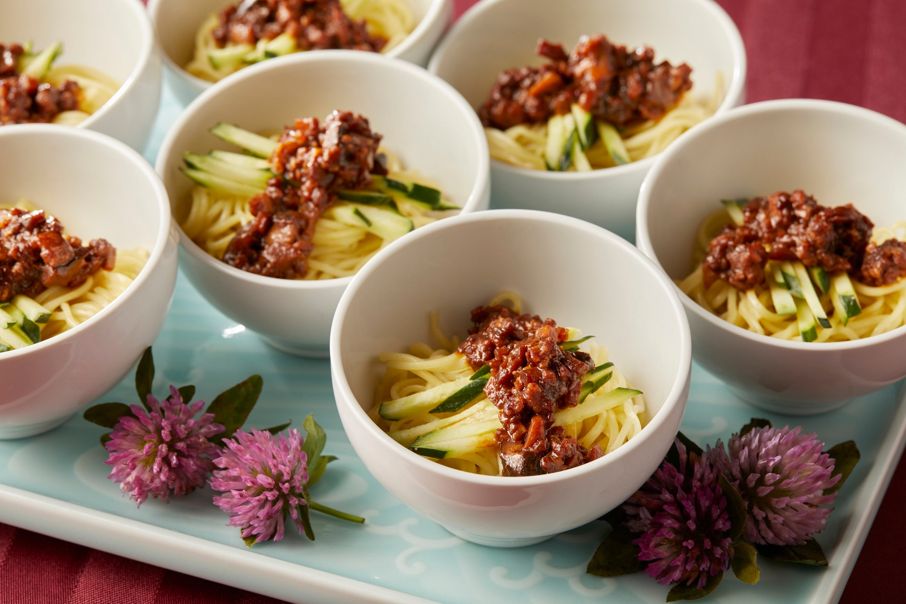 甜麺醤や豆板醤を合わせた濃厚な肉味噌をのせた炸醤麺。「東北牧場」産の唐辛子でつくったラー油をお好みでかけてお召し上がりください。