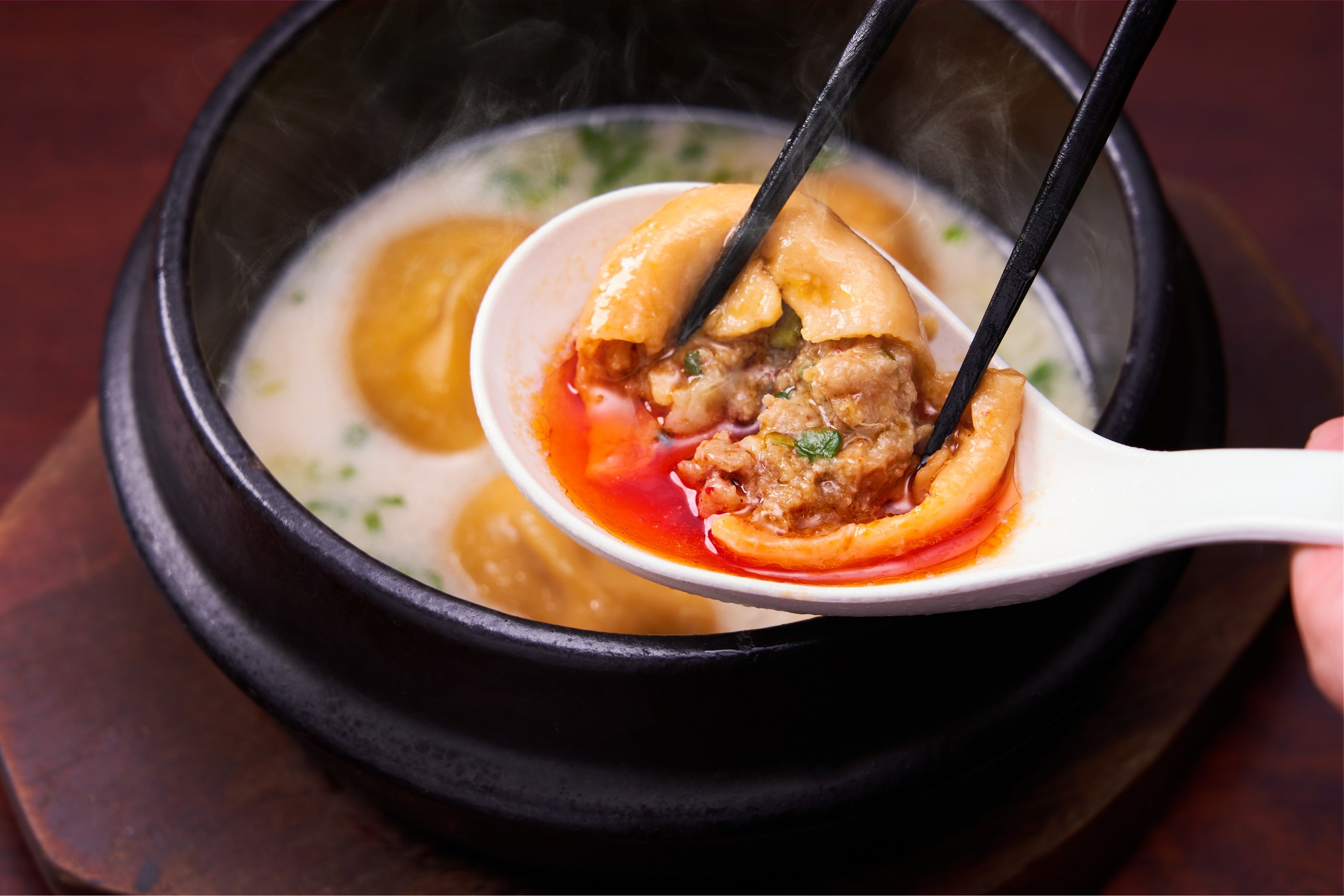 ・途中で水餃子を割ると、辛い肉汁が豚骨スープに溶け込み白丸から赤丸への味変を楽しめます