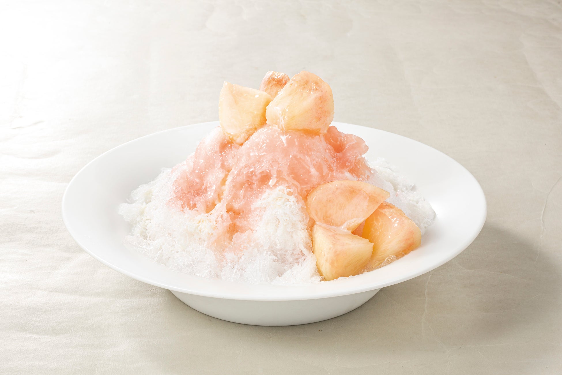 ふんわりとしたかき氷に、ほんのり桃色のピーチソースをとろ〜りとかけて、みずみずしい桃のコンポートをトッピングしました。大きめにカットした桃をごろごろのせた、プチごほうび気分のかき氷♪ 風味豊かなピーチソースは、大人にはどこか懐かしく、お子さまにも親しみやすい、やさしい香りと甘さが魅力です。