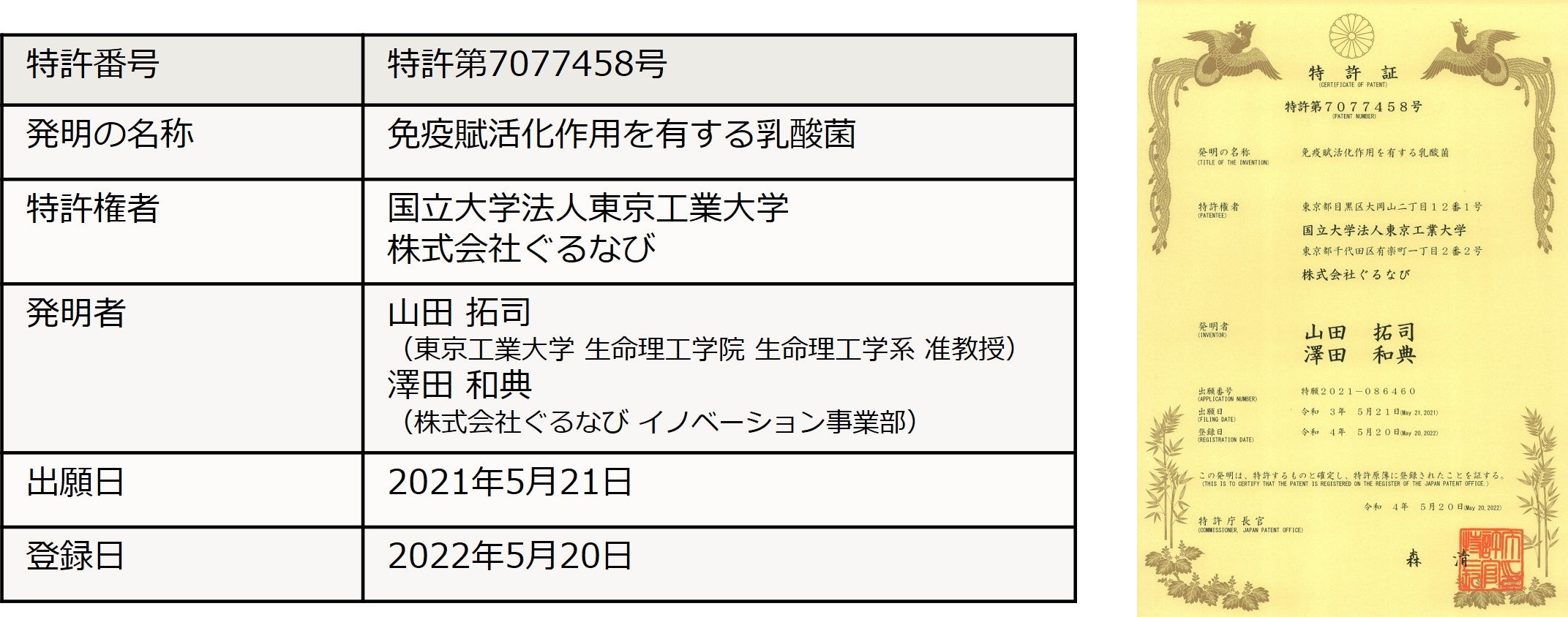 株式会社ぐるなび(本社:東京都千代田区、代表取締役社長:杉原章郎 以下、ぐるなび)は、東京工業大学と「ぐるなび食の価値創成共同研究」として、日本の食文化を支える発酵をテーマとした共同研究を2016年に開始。この度、2022年5月20日に「免疫賦活化作用を有する乳酸菌」の特許を取得したことをお知らせいたします。