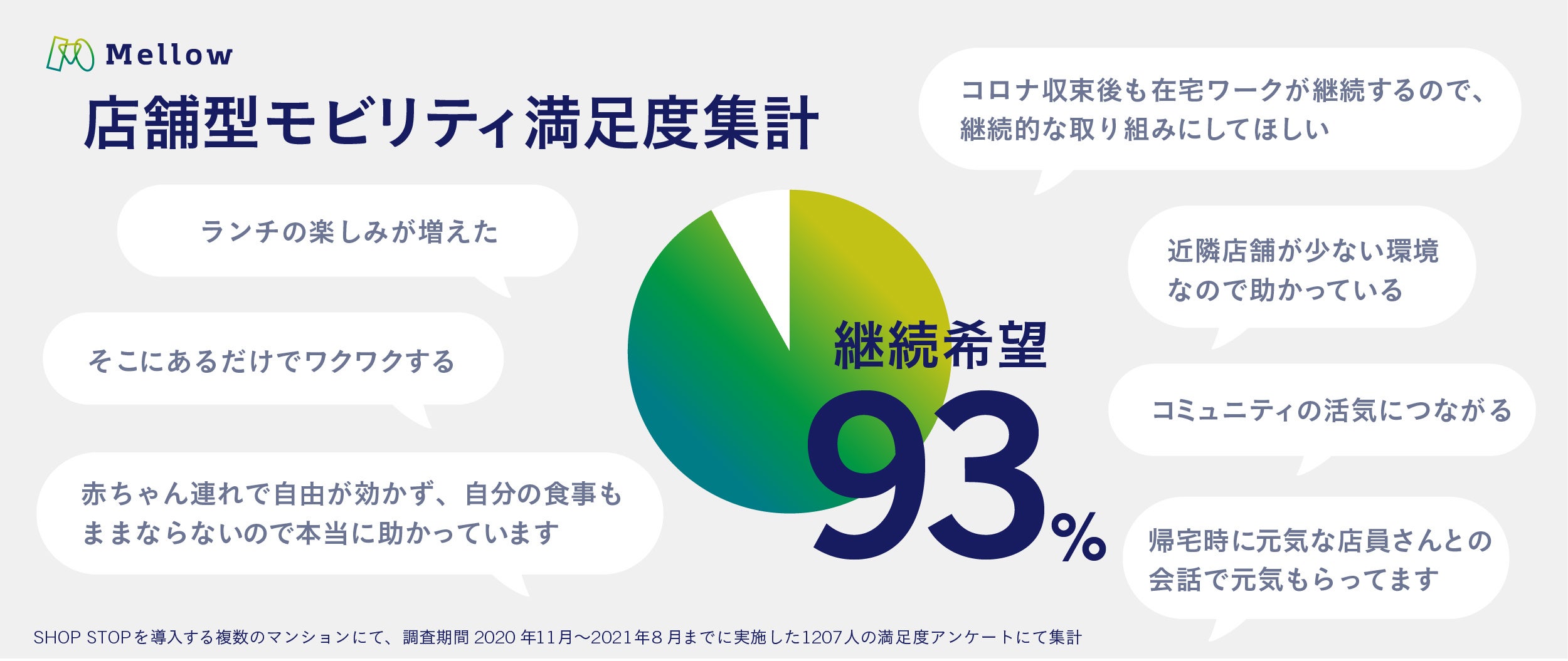 キッチンカーをはじめとする店舗型モビリティは、移動することで小さな商圏を成立させていくことが可能なため、多種多様なサービスが生まれます。その集合体となる「SHOP STOP」は、毎日店舗が入れ替わる仕組みを構築することで、顧客のさまざまなニーズに応え、街の風景に変化を生み、効率的、継続的にワーカーや地域住民の満足度向上につながるコンテンツを届けています。実際に、メロウの「SHOP STOP」を通じて店舗型モビリティを配車する複数のマンションで実施したアンケート結果を集計したところ、サービスの継続を望む人が約93%と、高い満足度を示す結果となりました。(※3)