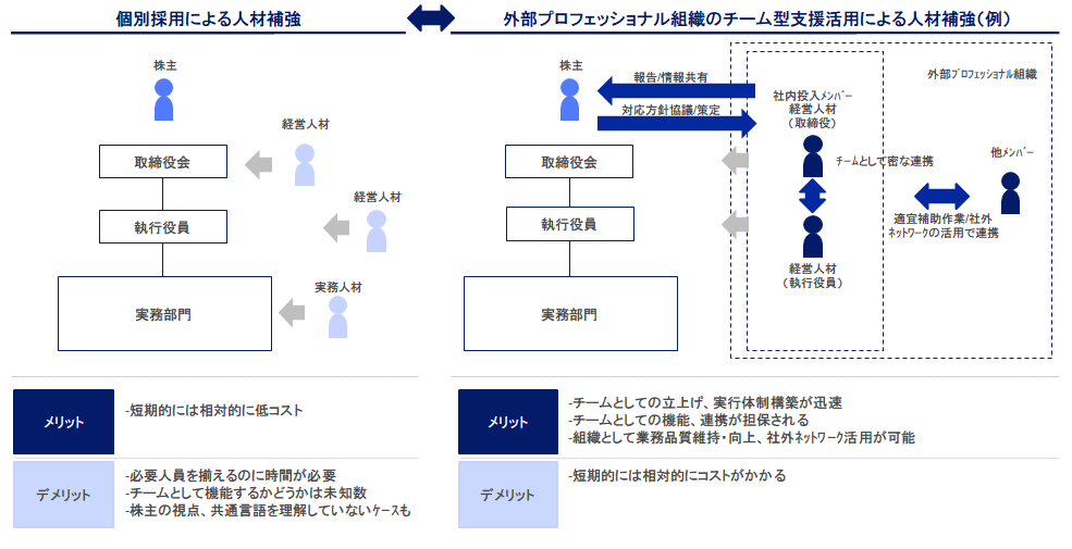 その中で近年支援形態の1つとして実例、実績が多くなってきているのが、企業において成長や再生実現を目指すにあたり、機能補完を必要としている経営者人材や経営幹部人材、また経営企画人材や主要業務の責任者人材を複数名チームとして派遣し、経営を直接的に担う「プロ経営者・チーム派遣サービス」です。