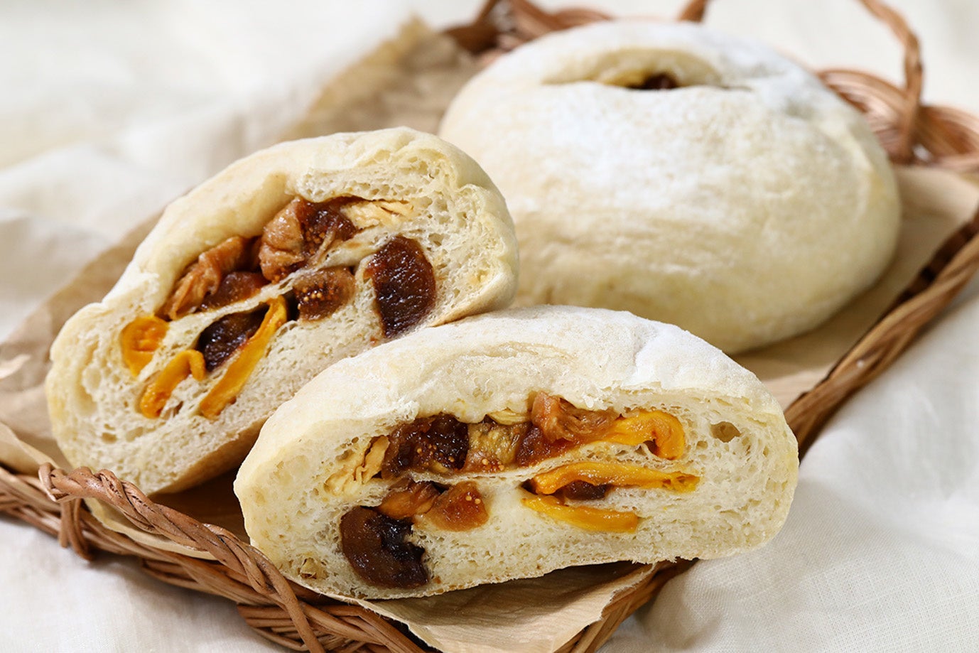 赤ワインに漬けたあんず、イチジク、白ワインに漬けたパイナップル、マンゴーのドライフルーツを包んで焼き上げ、ドライフルーツの甘酸っぱさを存分にお楽しみいただけるブールに仕上げました。