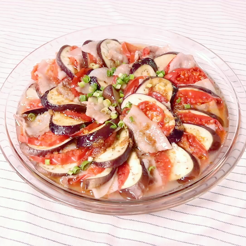 例えば、薄切りの豚肉とスライスしたなすを重ねて、さらにこちらも夏野菜のトマトのスライスも加えレンジで蒸し焼きにすれば、さっぱりとしながらも栄養バランスもよいメイン料理ができます。ごま油とポン酢をまぜたタレをかけると美味しいですよ。仕上げに生姜を利かせるとさらにサッパリと食べられます。(ご家庭の電子レンジによって加熱時間が異なりますのでご調整ください。)