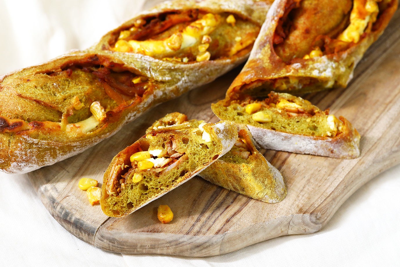 カレー粉を練りこんだ生地に、とうもろこし、タンドリーチキン、クリームチーズを包んで焼き上げた具沢山な季節のバゲットです。