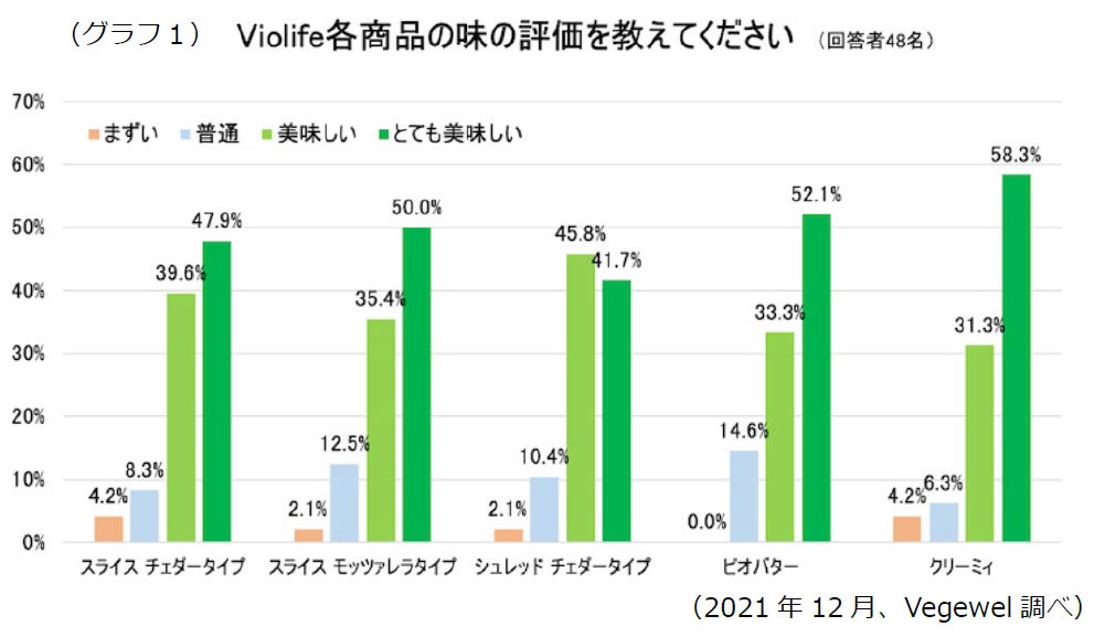 グラフ1は、当社が日本最大のプラントベース専門インターネットサイト「Vegewel」内でモニターを募集して昨冬に実施した、「Violife」シリーズに関する生活者へのアンケート結果です。「美味しい」「とても美味しい」との回答が85%以上を占めました。他にもSNS上で「まぁ食べられるかなというレベルじゃなく美味しい!」「アレルギーの息子も美味しそうに食べてくれた!」「ずっと探してたヴィーガン向けチーズ」など、“みんなが楽しめるおいしさ”を評価する声を多数頂きました。