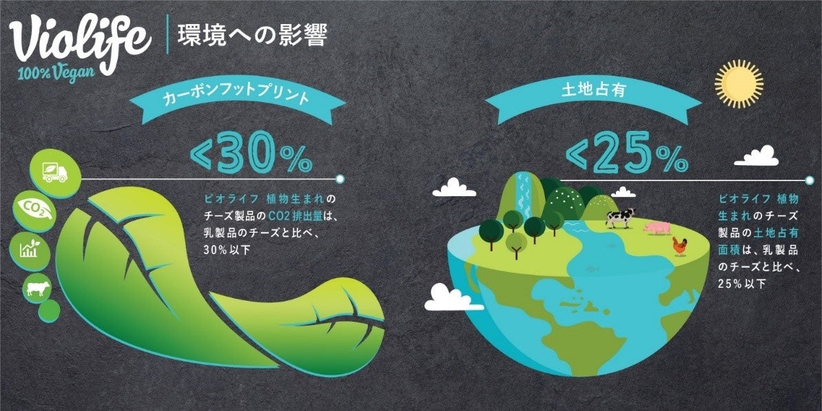 当社が日本国内で販売している「Violife」植物生まれのチーズ既存4商品について、生産から廃棄までのライフサイクルにおけるCO₂排出量が、日本国内で販売されている乳製品のチーズの30%以下に、土地占有面積も25%以下に抑えられていることが判明しました※2。主な理由は、この商品がココナッツオイルなどの植物を主原料としており、乳牛を生育する工程が不要であることに由来しています。