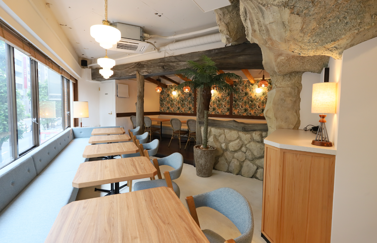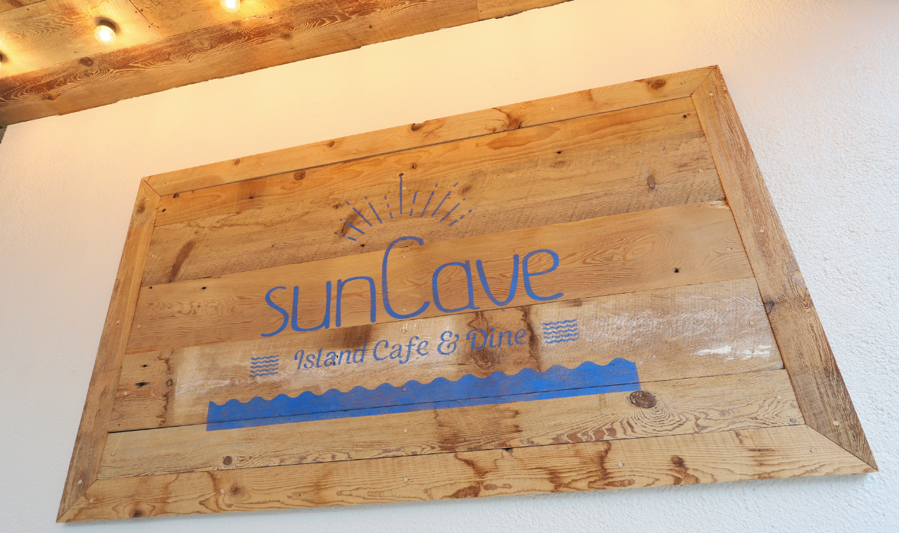 ■今回のグランドオープンに際し、当店は久米島をはじめとする新鮮な島野菜や食材を使用し、ハワイや沖縄の海辺でリラックスできるようなカフェレストランをコンセプトした。店舗内装デザインは、クライアント様から造作で残っていた岩塗装を活用したいと依頼を受け、「海辺の洞窟のような演出にしたい」というアイディアをもとに打ち合わせを重ね、「sunCave (太陽と洞窟)」という海辺の洞窟から溢れる太陽をイメージした店内になっている。