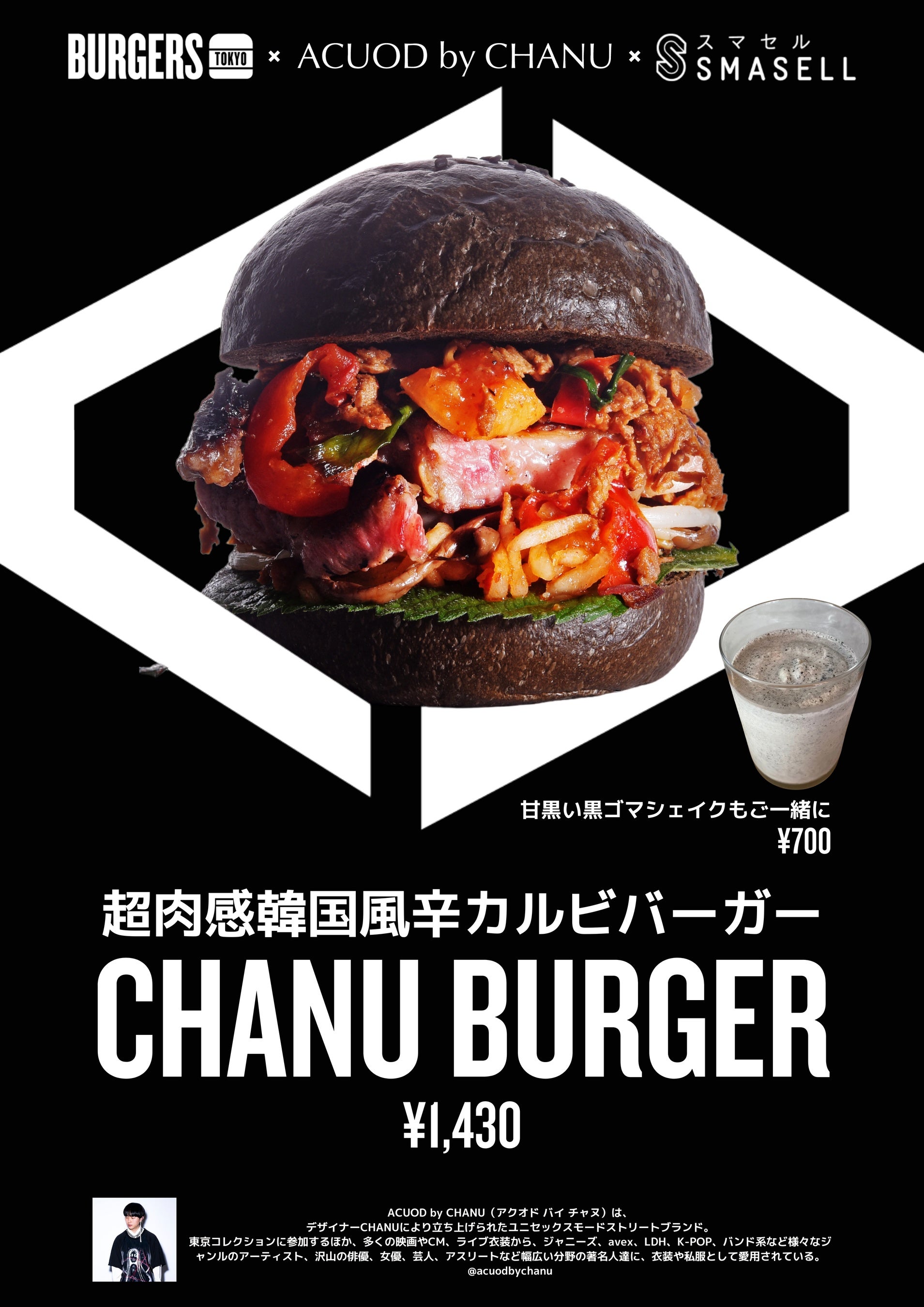 ACUOD by CHANUデザイナーチャヌこだわりの韓国カルビをブランドカラーの黒いイカ墨バンズでサンドし韓国✖️超肉感バーガーのマッシュアップ。エゴマの葉、ナムルもプラスし青とうがらしで辛さを引き立たせたホットなバーガー。