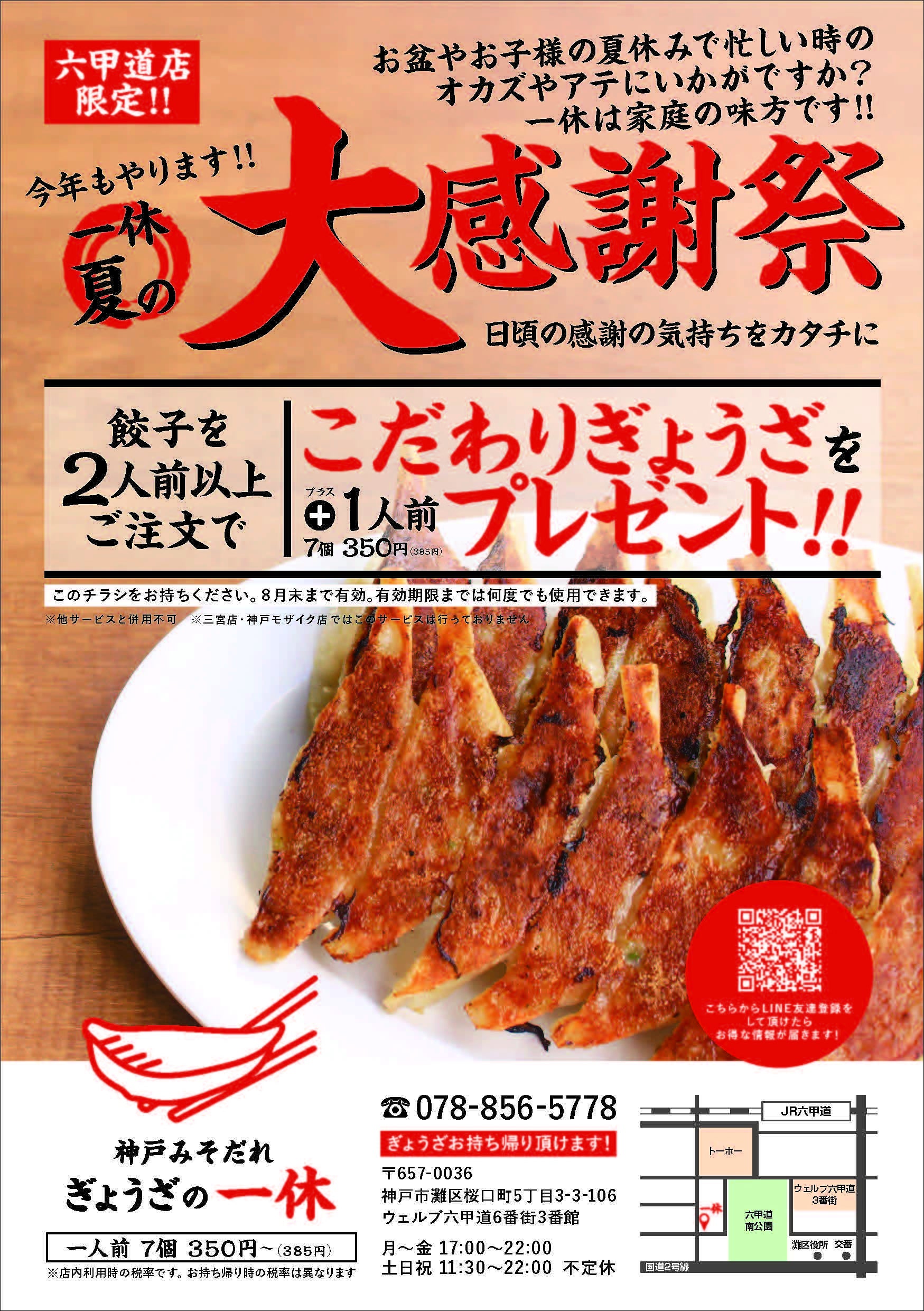餃子2人前以上のご注文で、1人前の餃子プレゼント!!お得な大感謝祭には、チラシかこの記事内の画像データを持って行くだけでどなたでも何度でもご参加していただけます!ぎょうざの一休六甲道店にて2022年7月1日から8月31日の期間限定で開催します。