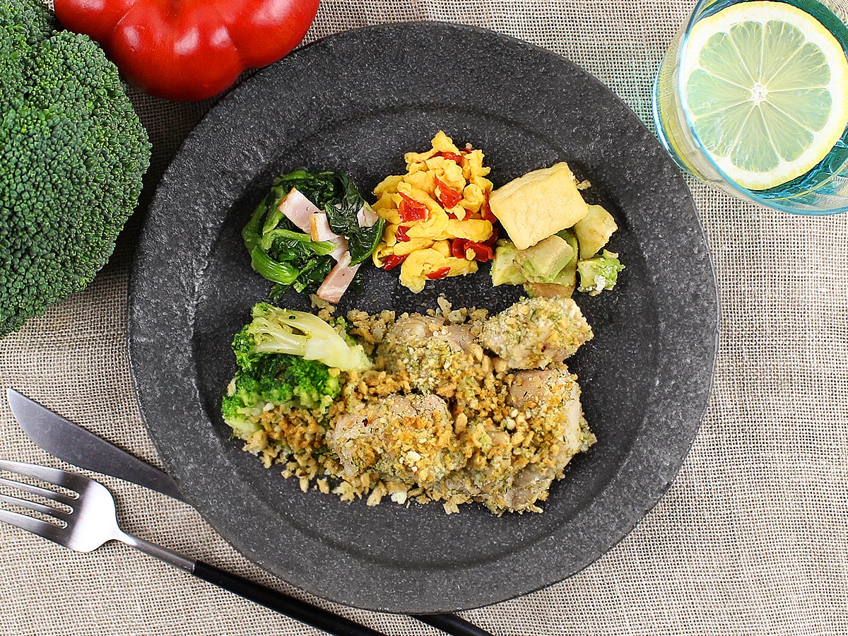 さっぱりとレモンをきかせたチキンのガーリックオイル焼きをご用意いたしました。しっとりと焼き上げた鶏もも肉に青のり、大豆ミートとチーズをトッピングしております。鶏肉の旨味を吸ったブロッコリーと共にお召し上がり下さい。