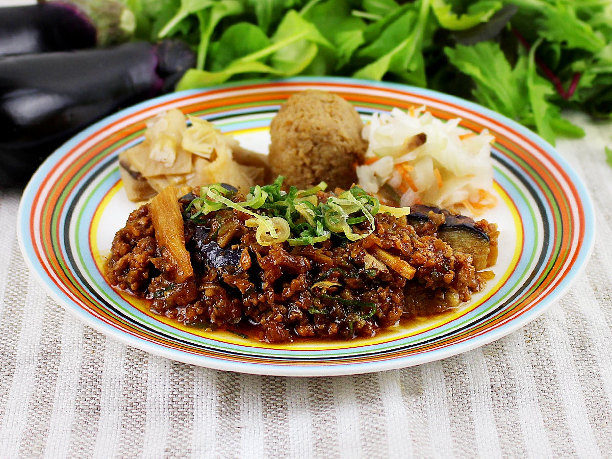 とろっと食感の揚げ茄子と薄くスライスしたたけのこに麻婆餡を絡めました。麻婆餡には甘辛く味付けした肉そぼろ、長ねぎと甜麺醤を使用し、辛さの中にもほんのり甘みを感じるように仕上げております。