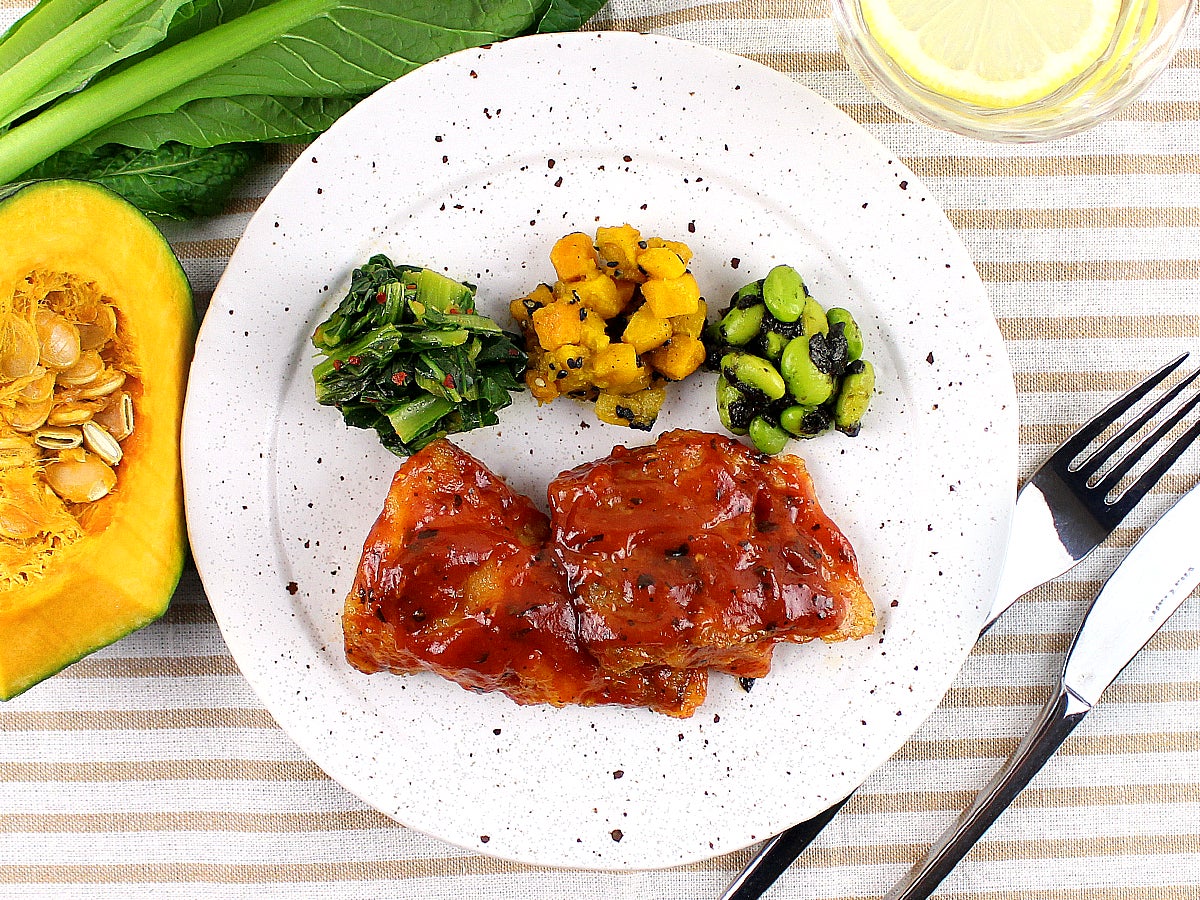 副菜は、小松菜のナムル、黒ごまと糖蜜をからめた大学かぼちゃ、枝豆の海苔あえです。