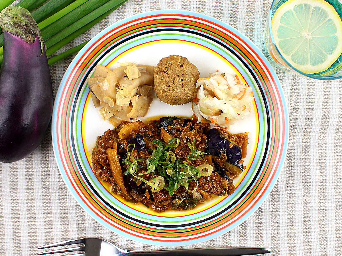 とろっと食感の揚げ茄子と薄くスライスしたたけのこに麻婆餡を絡めました。麻婆餡には甘辛く味付けした肉そぼろ、長ねぎと甜麺醤を使用し、辛さの中にもほんのり甘みを感じるように仕上げております。