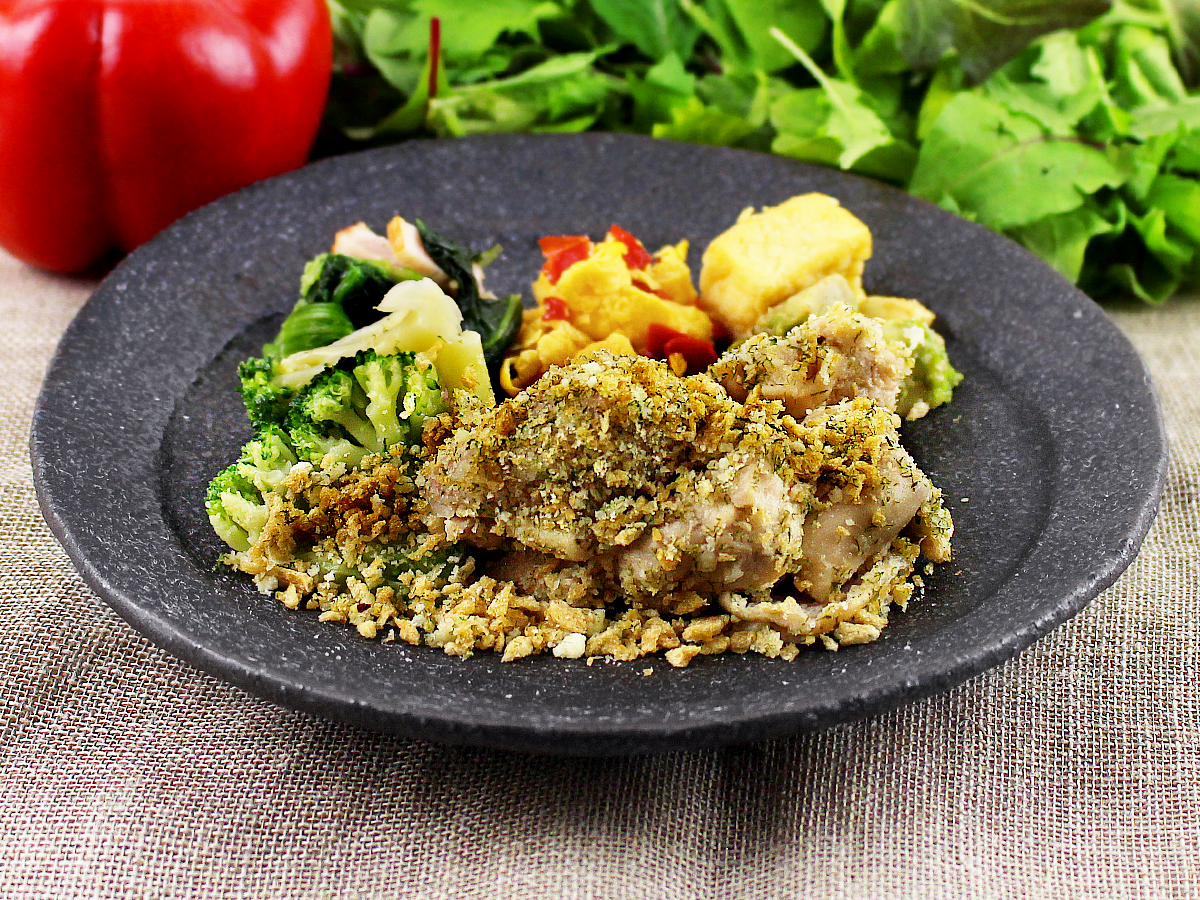 さっぱりとレモンをきかせたチキンのガーリックオイル焼きをご用意いたしました。しっとりと焼き上げた鶏もも肉に青のり、大豆ミートとチーズをトッピングしております。鶏肉の旨味を吸ったブロッコリーと共にお召し上がり下さい。