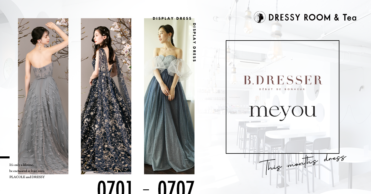 「PLACOLE & DRESSY」ブランドを展開する、冒険社プラコレ(本社:神奈川県鎌倉市、代表取締役CEO:武藤功樹)は、ウェディングドレスをもっと身近に、もっと気軽に、体感できる煌めく魔法の場所『お花とドレスと紅茶のお店 DRESSY ROOM&Tea』にて7月1日〜7日七夕迄の一週間、期間限定で「B.DRESSER/meyou 」の星ドレスを展示することをお知らせいたします。