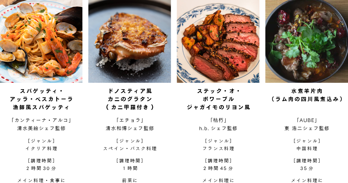 上記のなかから1品を選んでいただくと、ご予約したスペースに食材を事前にお届け。当日は、ご利用時間内にシェフが実演するレシピ動画を見ながら調理をします(各レシピの調理時間は最短で35分、最長で2時間45分)。できあがった料理は、広々したキッチン空間で楽しくおしゃべりしながら召し上がってください!