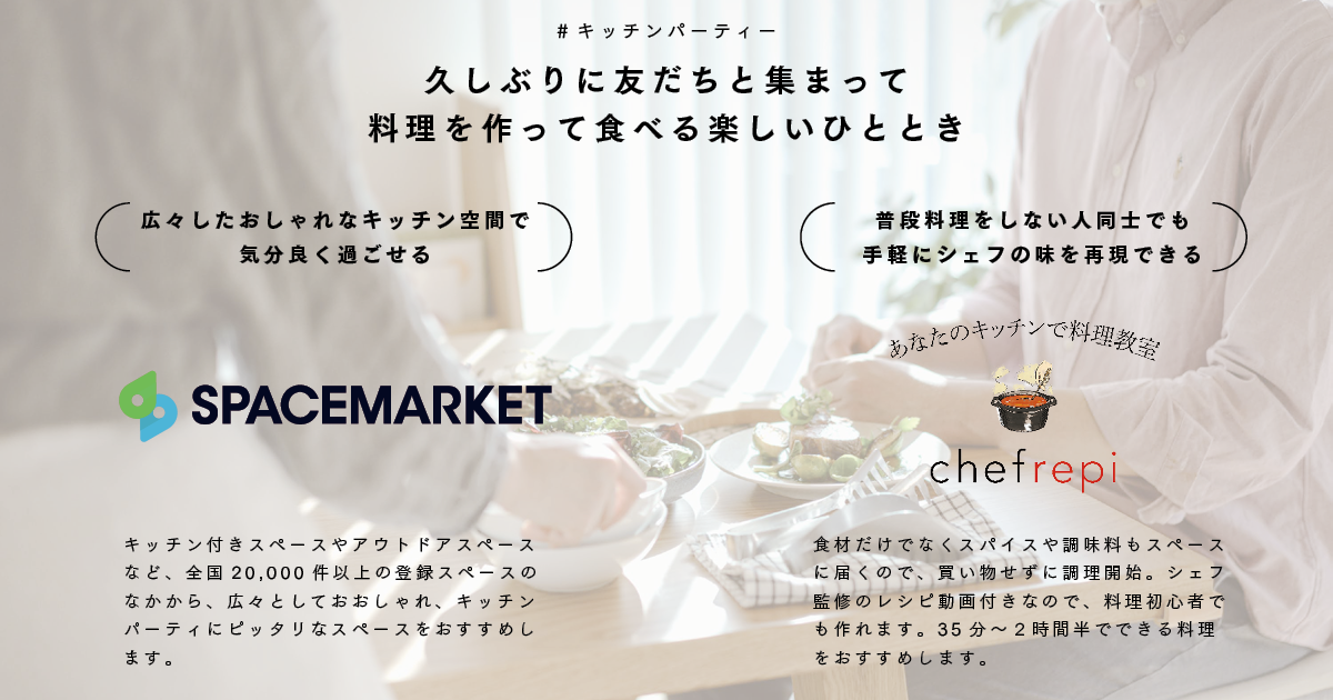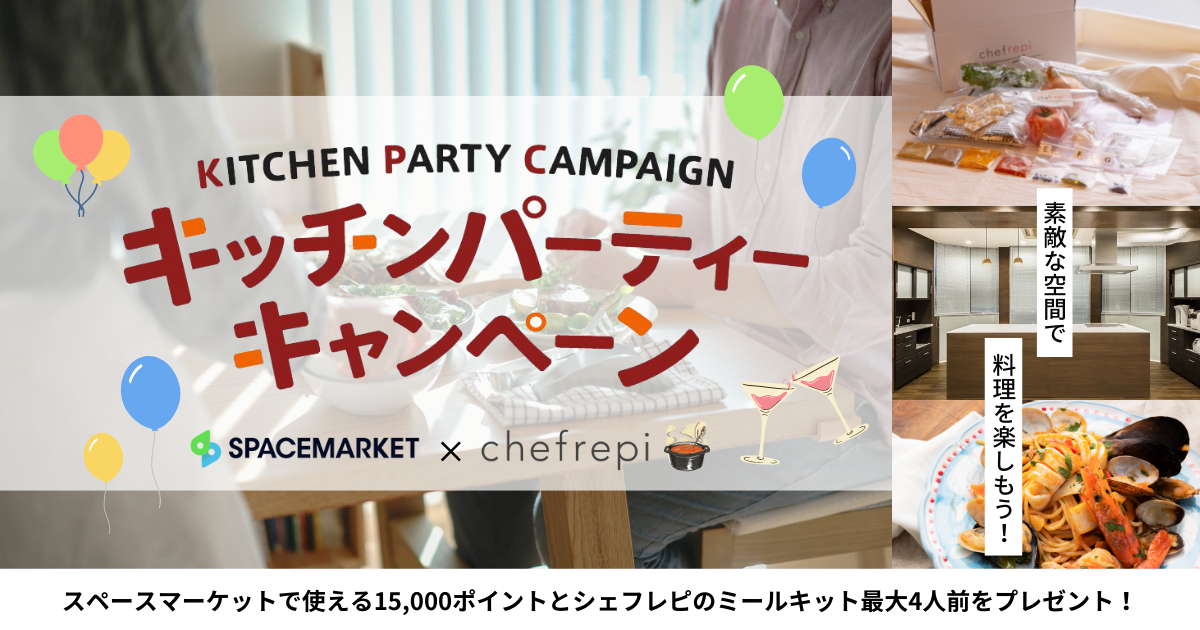 スペースシェアとシェフレピは共同で、料理好きな方々の久しぶりの再会をお祝いする「キッチンパーティーキャンペーン」と題したプレゼントキャンペーンを企画しました。