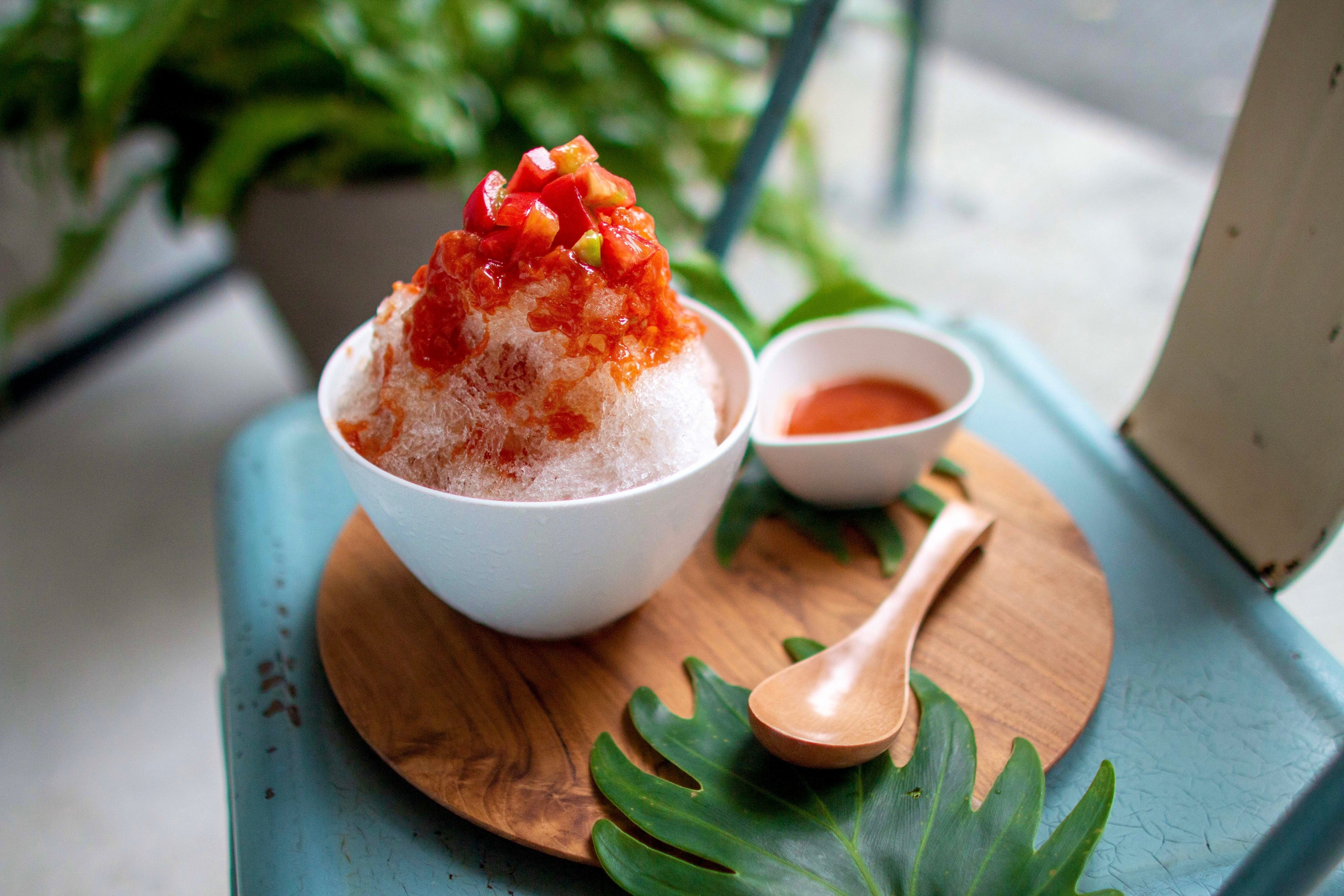 フランス・リヨンで修行を積んだ当店の谷口海志シェフによる、食材の特徴を最大限に引き出した自家製シロップを使ったかき氷メニュー。糖度の高いアメーラトマト煮て作り出した甘いソースをかけた「フルーツトマトのヴィーガンかき氷」。オプションでマスカルポーネチーズクリームのトッピングも可能。